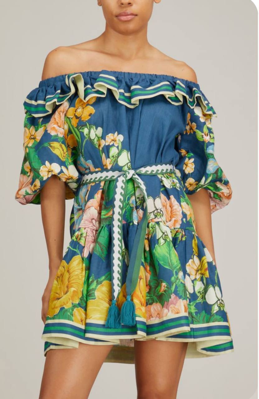 Платье Alemais LUX-91025 – это яркое летнее платье с цветочным принтом. Модель выполнена в стиле бохо, отличается открытыми плечами и пышными рукавами. Платье украшено поясом на талии и оборками, что придает ему женственности и легкости.