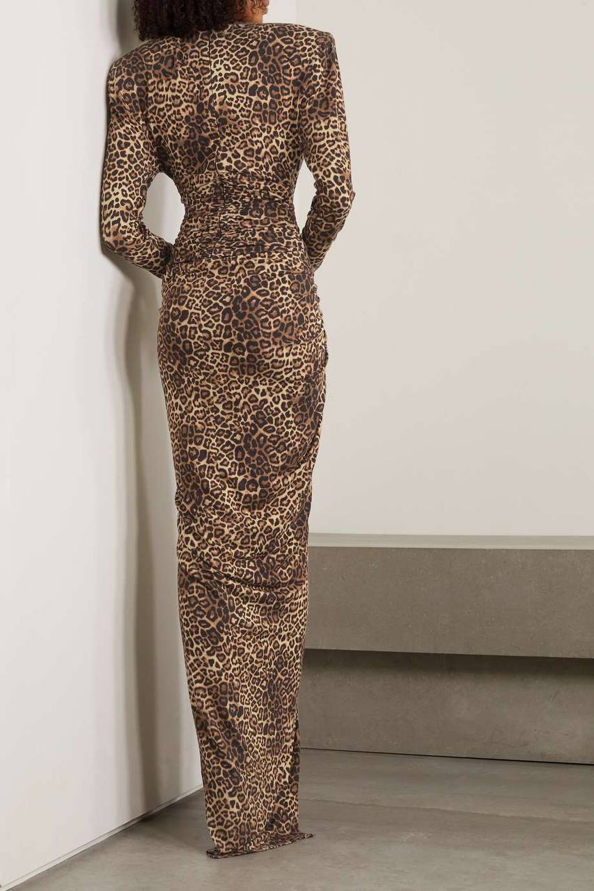 Платье Alexandre Vauthier LUX-84167 – это элегантное платье с длинными рукавами и глубоким V-образным вырезом, выполненное в смелом леопардовом принте. Юбка платья имеет разрез, добавляющий образу нотку сексуальности. Идеальный выбор для тех, кто хочет выделиться и подчеркнуть свою индивидуальность.