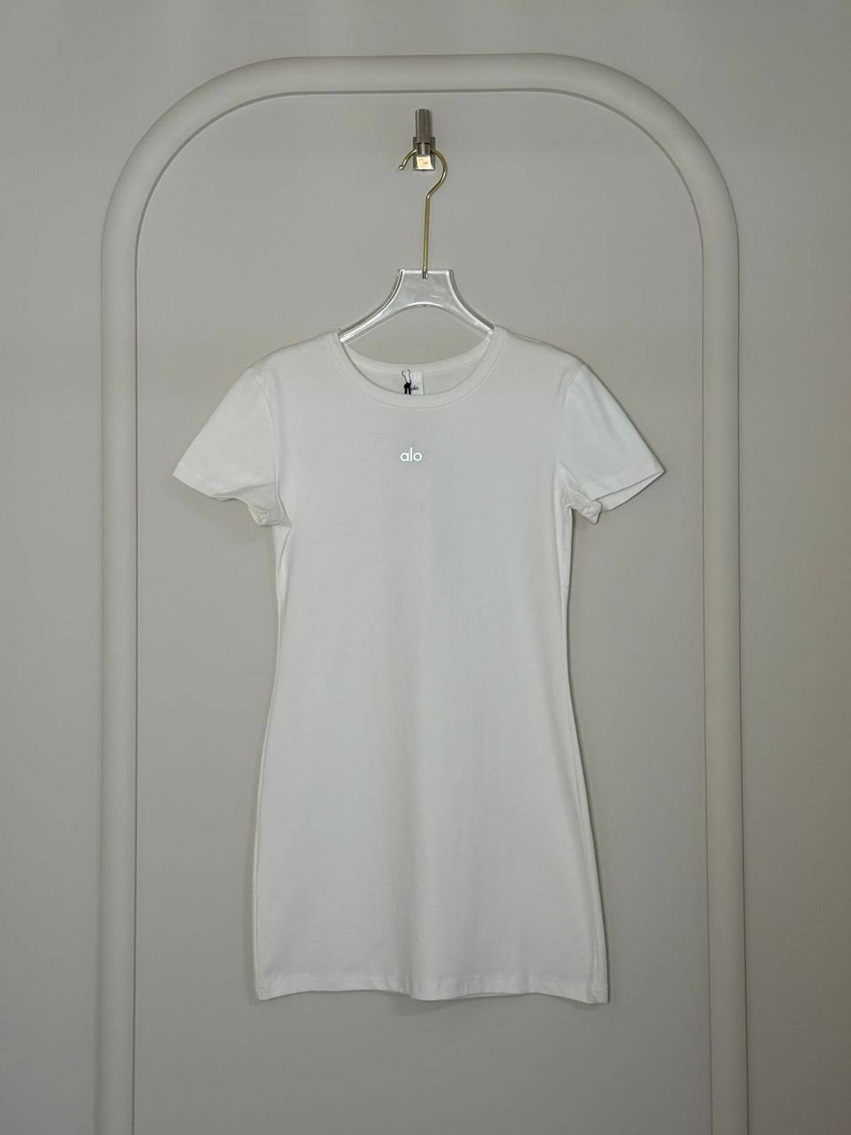 Платье Alo LUX-119454 — это минималистичное белое платье, выполненное в форме футболки, которое идеально подойдет для создания повседневных образов. Модель облегающего кроя, с короткими рукавами и круглым вырезом горловины. Платье подойдет для прогулок, встреч с друзьями или работы, сочетаясь с различными аксессуарами и обувью.
