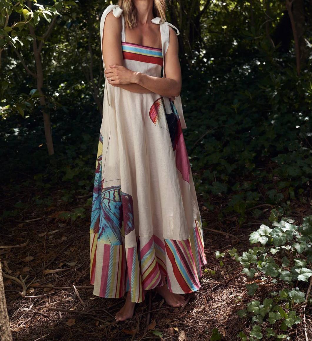 Платье Aston was Studio LUX-116275 — это элегантное платье макси, выполненное в свободном стиле. Бежевый цвет ткани дополнен яркими акцентами в виде разноцветных полос и принта в виде бабочек. Такое платье идеально подойдет для летних прогулок и создания стильных образов.