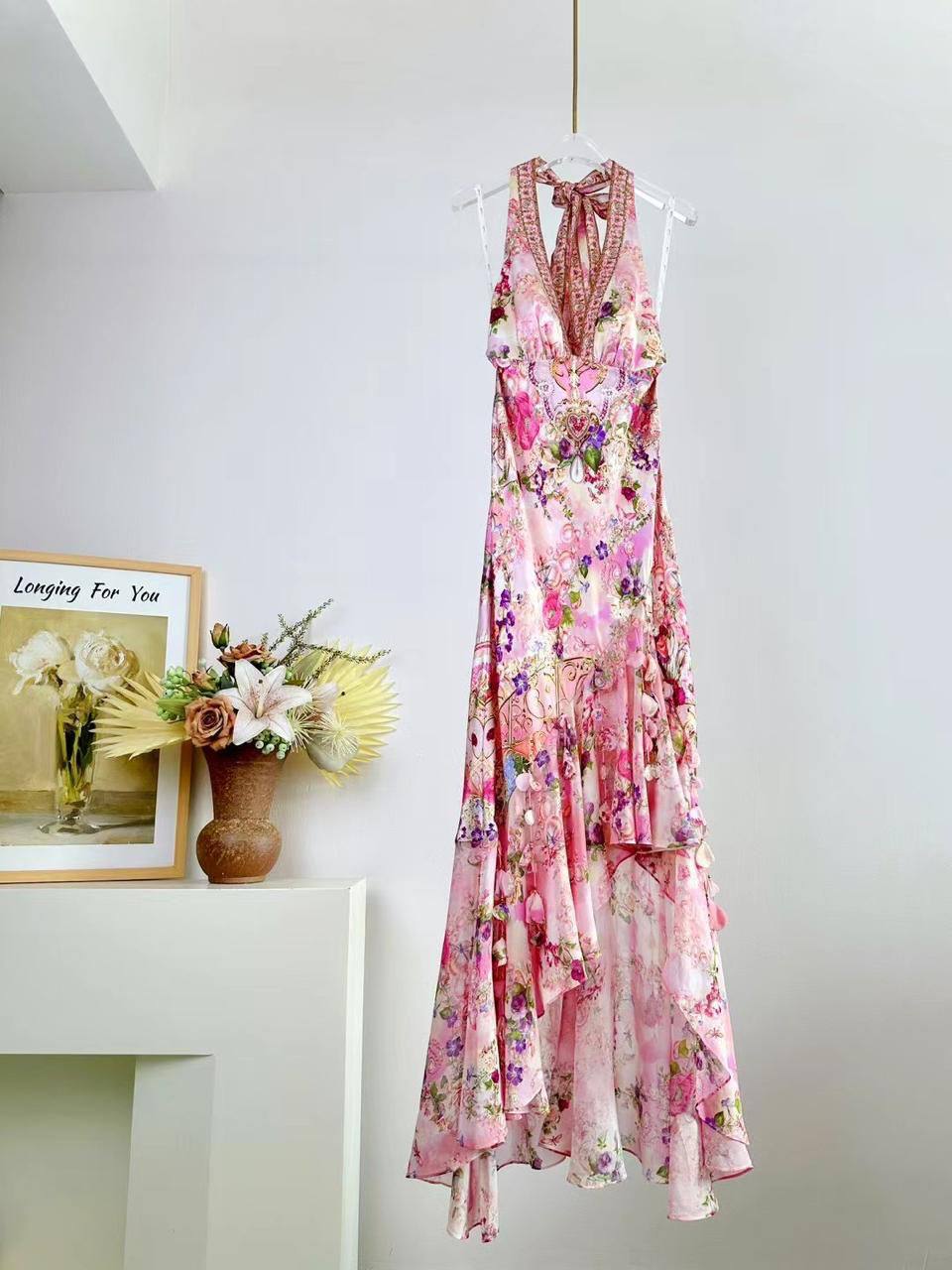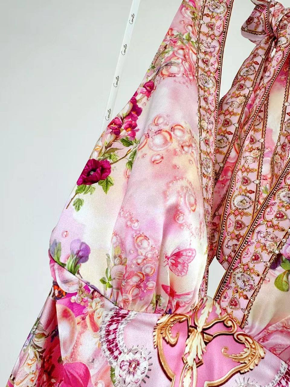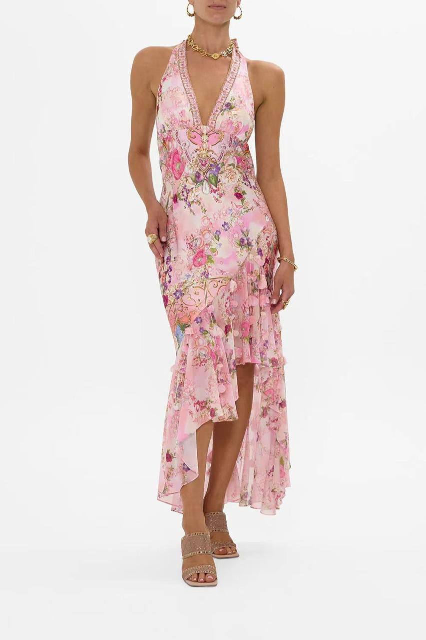 Платье Camilla (артикул LUX-115958) представляет собой элегантное платье в романтическом стиле. Платье выполнено в нежных розовых оттенках с цветочным принтом. Характерной чертой является асимметричный подол и интересный крой лифа.