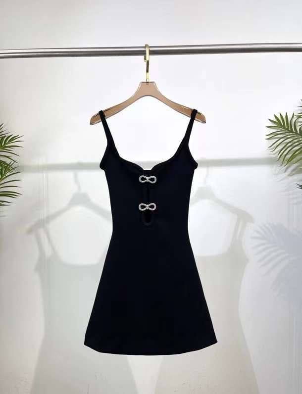 Платье MACH & MACH LUX-90654 — это элегантное черное платье на тонких бретелях. Оно выполнено в минималистичном стиле с акцентом на деталях, таких как декоративные элементы в виде бантиков на груди. Отлично подходит для создания стильных образов для различных мероприятий.