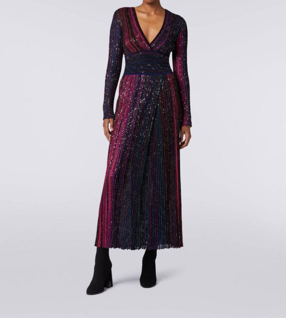 Платье Missoni LUX-105299 – это элегантное платье в стиле Missoni. Оно выполнено в ярких оттенках с преобладанием розового, синего и фиолетового цветов, создает привлекательный образ. Платье с длинными рукавами и V-образным вырезом. Его можно использовать для особых случаев.