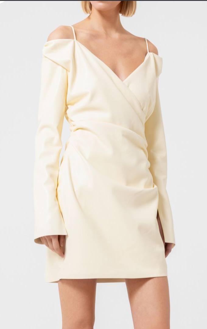 Платье NANUSHKA LUX-81001 – элегантное платье кремового цвета с длинными рукавами и акцентом на открытых плечах. Платье имеет V-образный вырез и драпировку на талии, что создает женственный силуэт. Оно подойдет для создания утонченных и стильных образов для различных мероприятий.