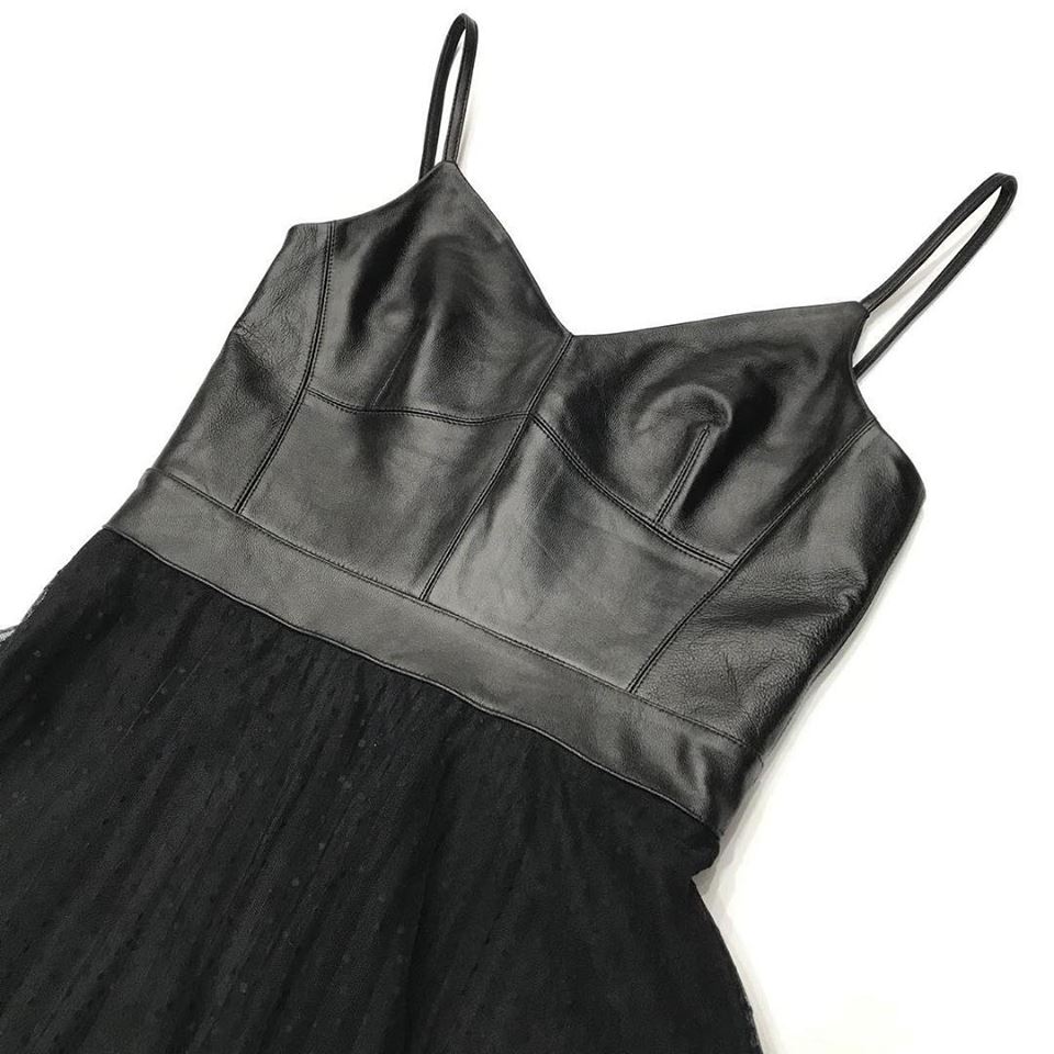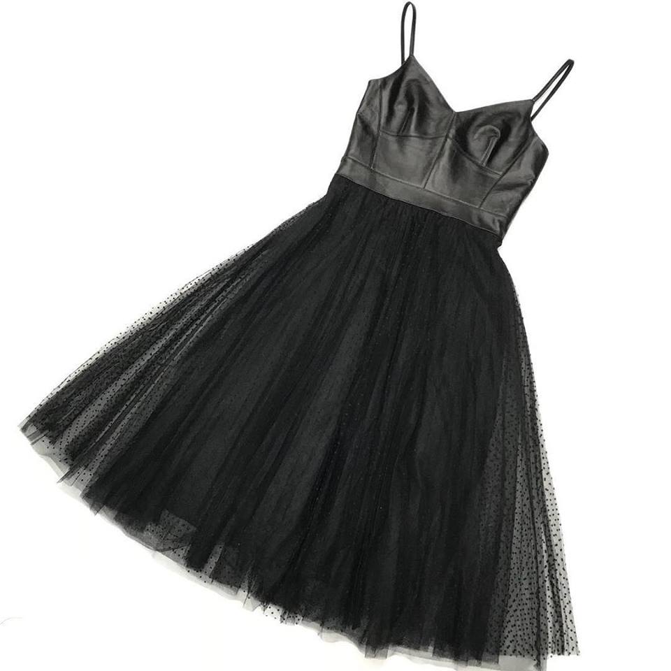 Платье ОДЖ-1357 от бренда ОДЖ представляет собой элегантное вечернее платье, выполненное в контрастном сочетании материалов. Верхняя часть платья имитирует кожаный лиф с тонкими бретелями, а пышная юбка выполнена из легкой, воздушной ткани с мелким горошком, создавая женственный и романтичный образ.