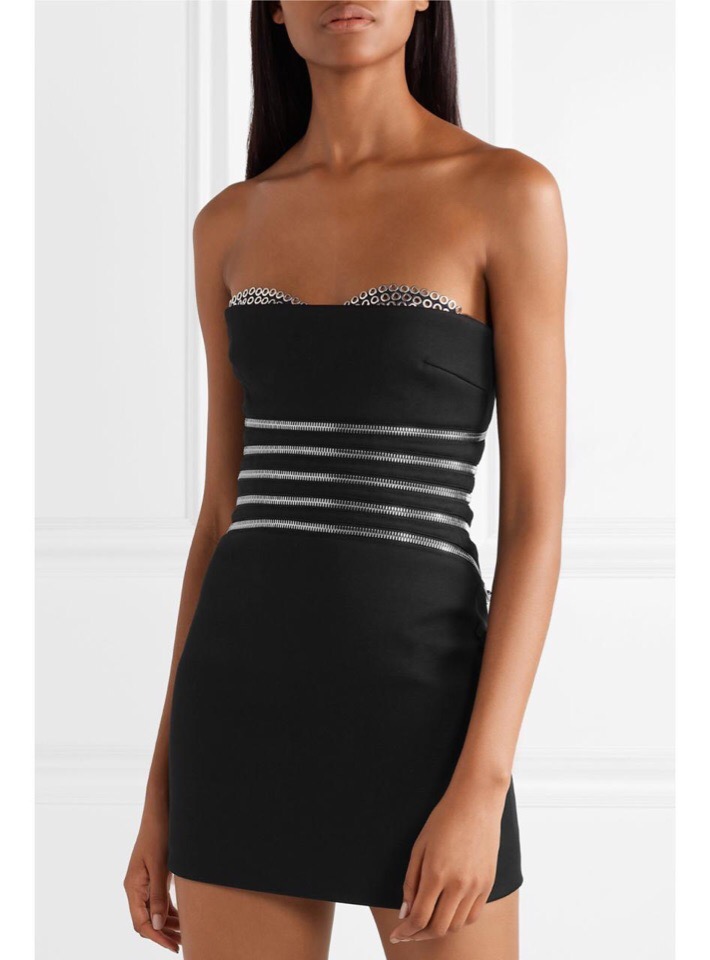Это элегантное мини-платье без бретелек от бренда ОДЖ, артикул 553, выполнено в черном цвете. Его изюминкой является оригинальный дизайн с декоративными молниями на талии и по верхнему краю, а также кольцами, создающими эффектный вырез. Платье идеально подчеркивает фигуру и добавит образу нотку дерзкой элегантности.