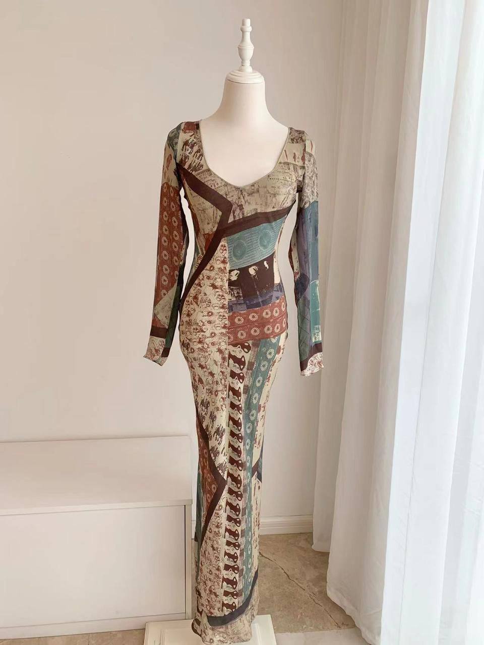 Платье Realisation LUX-107672 представляет собой изысканное платье в пол с длинными рукавами и глубоким V-образным вырезом. Платье выполнено в стиле пэчворк с сочетанием различных узоров и оттенков, что придает ему уникальный и богемный вид. Идеально подходит для создания элегантного образа.