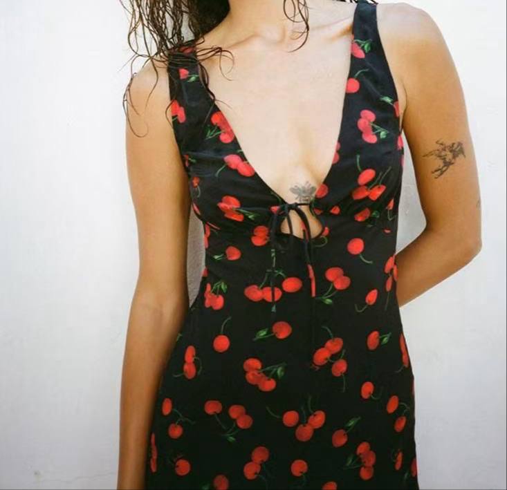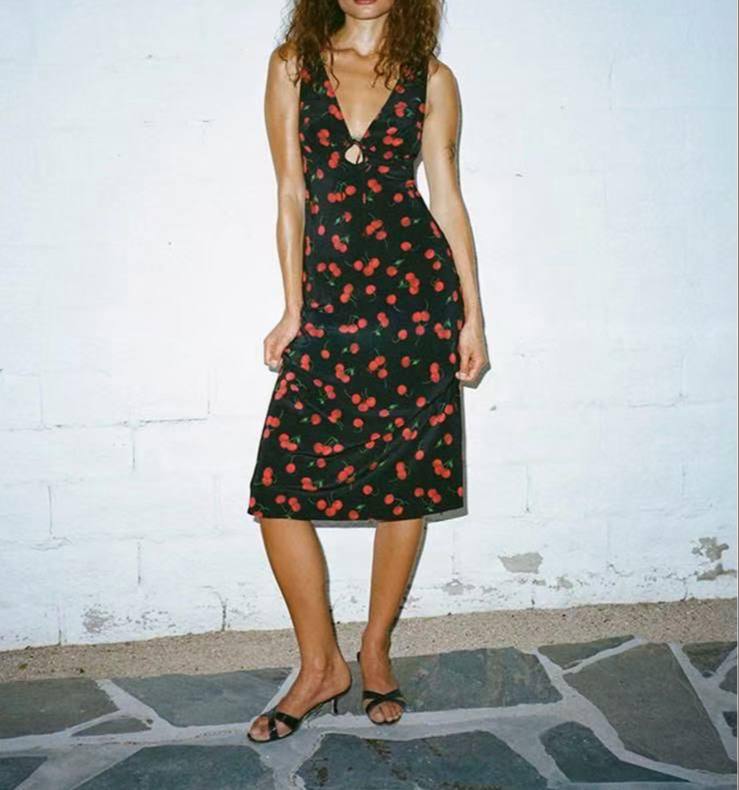 Платье Realisation LUX-116991 - это летнее платье с ярким цветочным принтом в виде вишен. Оно выполнено в стиле миди с глубоким V-образным вырезом и акцентом на талии. Черный фон платья дополнен красными ягодами, что делает его привлекательным и стильным.