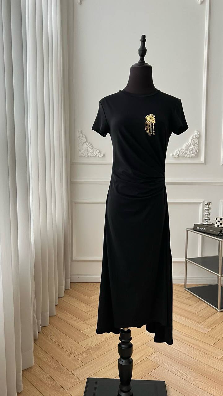 Платье Schiaparelli LUX-119776 – это элегантное черное платье, представляющее собой образец современного дизайна и утонченного стиля. Модель имеет короткий рукав и акцент на драпировке в области талии, что придает изысканность образу. Спереди платье украшено декоративной брошью золотистого цвета, добавляющей акцент и делающей образ запоминающимся.