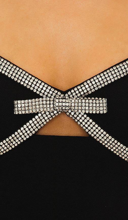 Платье Self-Portrait (LUX-100651) — элегантное черное платье, выполненное в классическом стиле. Оно имеет приталенный силуэт, который подчеркивает фигуру, и длинные рукава. Декоративная деталь в виде банта с кристаллами на груди добавляет изысканности и делает его подходящим для вечерних мероприятий.