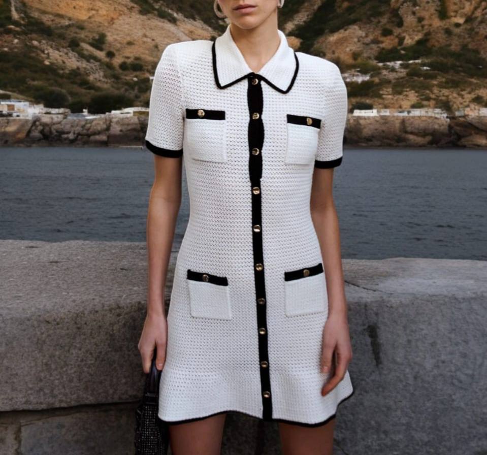 Платье Self-Portrait LUX-105673 представляет собой элегантное трикотажное платье в стиле casual. Белый цвет платья контрастирует с черными деталями на воротнике, карманах и манжетах. Оно имеет облегающий силуэт, короткие рукава и застегивается на пуговицы.