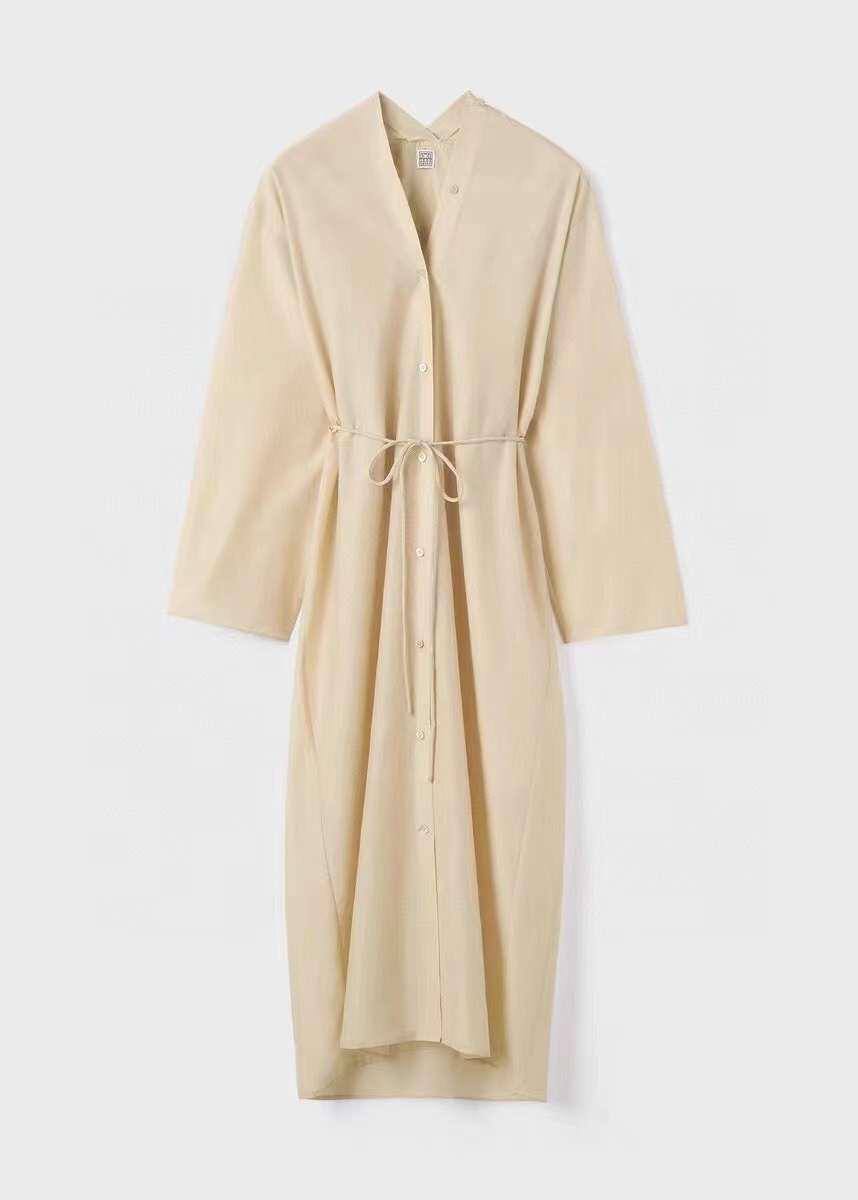 Платье Toteme LUX-86255 – это элегантное платье-рубашка кремового оттенка с поясом на талии. Модель выполнена в минималистичном стиле, с длинными рукавами и V-образным вырезом. Идеально подходит для создания повседневного образа.