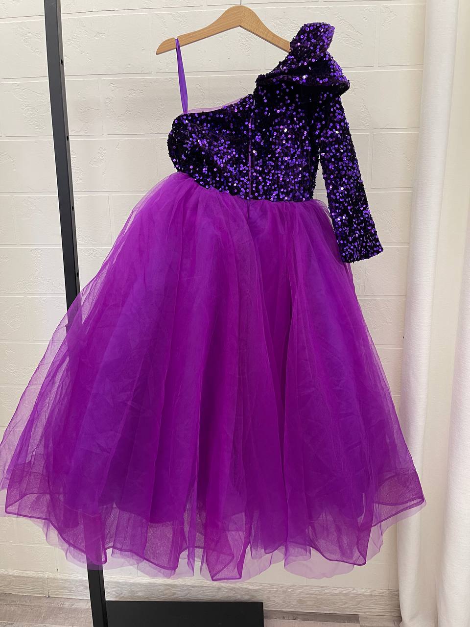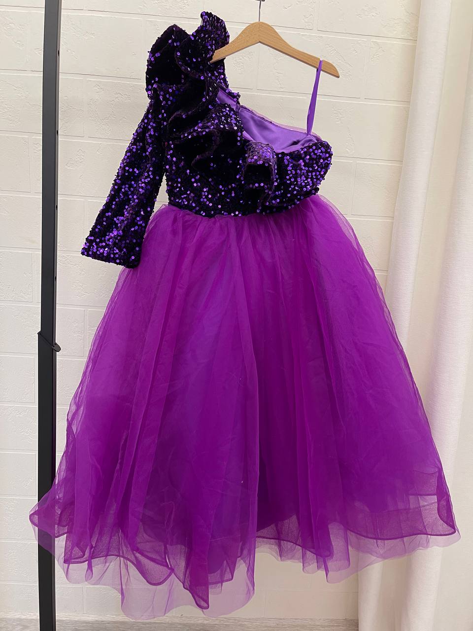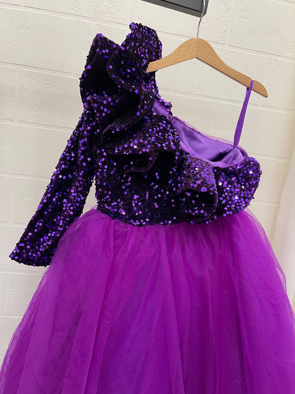 Платье LUX-109271 — это элегантное вечернее платье с оригинальным дизайном. Верхняя часть платья выполнена в форме топа с одним рукавом, украшенного пайетками. Яркий фиолетовый цвет и объемная юбка из фатина создают запоминающийся образ, который подойдет для особых случаев.