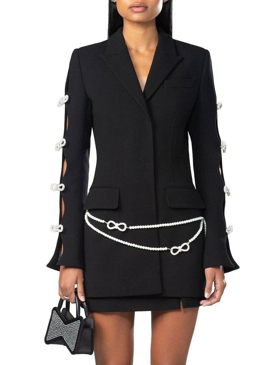 Платье - жакет Mach & Mach LUX-96384 представляет собой стильное решение для создания элегантного образа. Жакет выполнен в классическом черном цвете, который добавляет универсальности. Изделие сочетает в себе элементы жакета и платья, что делает его привлекательным для различных мероприятий.
