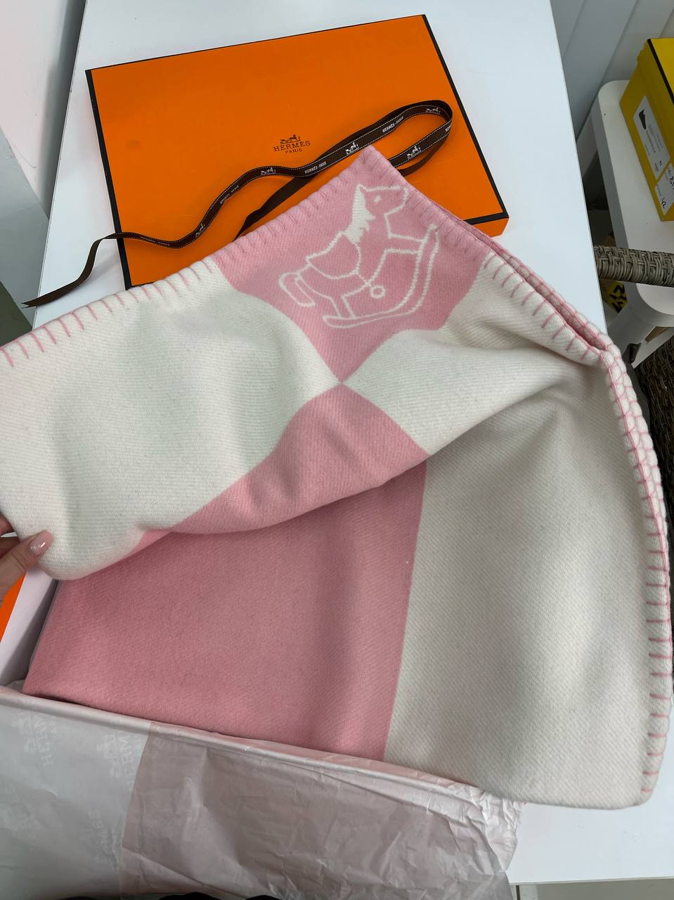 Плед LUX-68810 от Hermes Paris — это элегантный аксессуар, выполненный в классическом стиле. Он станет прекрасным дополнением к интерьеру, создавая уют и тепло. Нежный дизайн с изображением лошадки-качалки и ромбовидным узором в розовых и белых тонах придает пледу особое очарование, делая его идеальным для детской комнаты или как подарок.