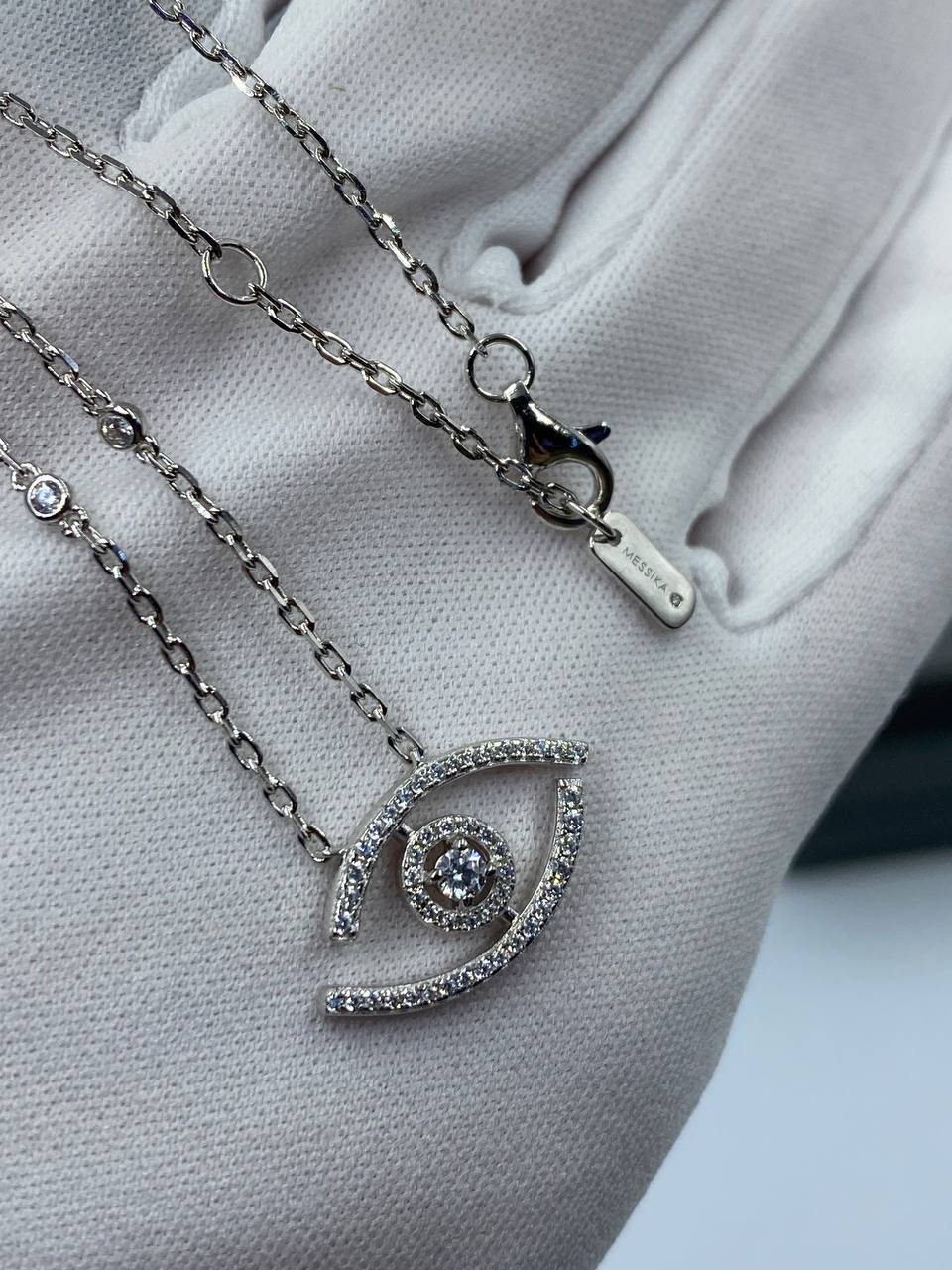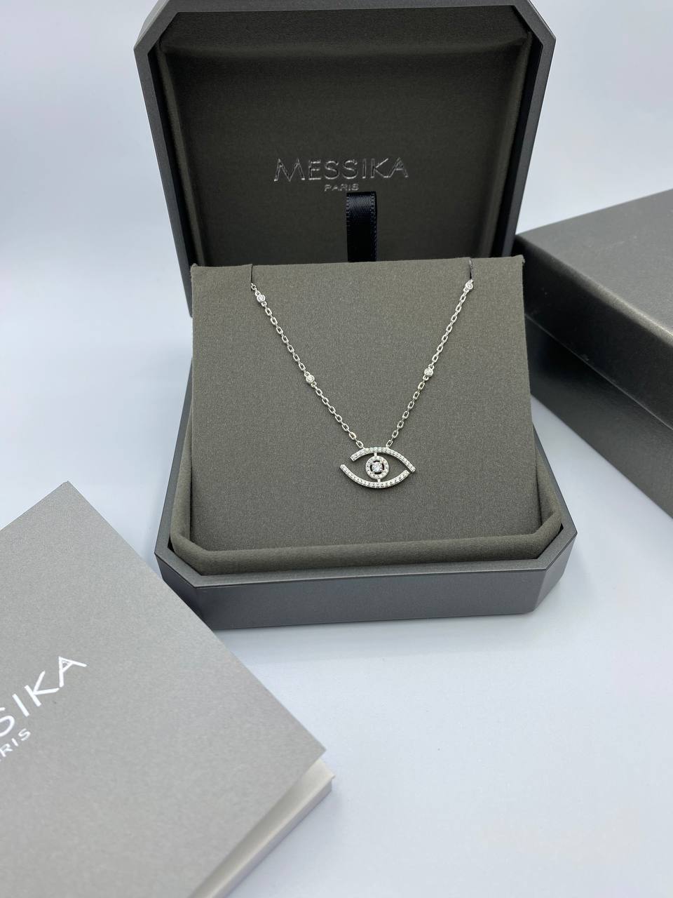 Подвеска Messika LUX-97553 — это элегантное украшение, выполненное в изысканном стиле. Серебряная подвеска в форме глаза, усыпанная блестящими камнями, привлекает внимание своей утончённостью и блеском. Идеально подходит для повседневной носки и для особых случаев.