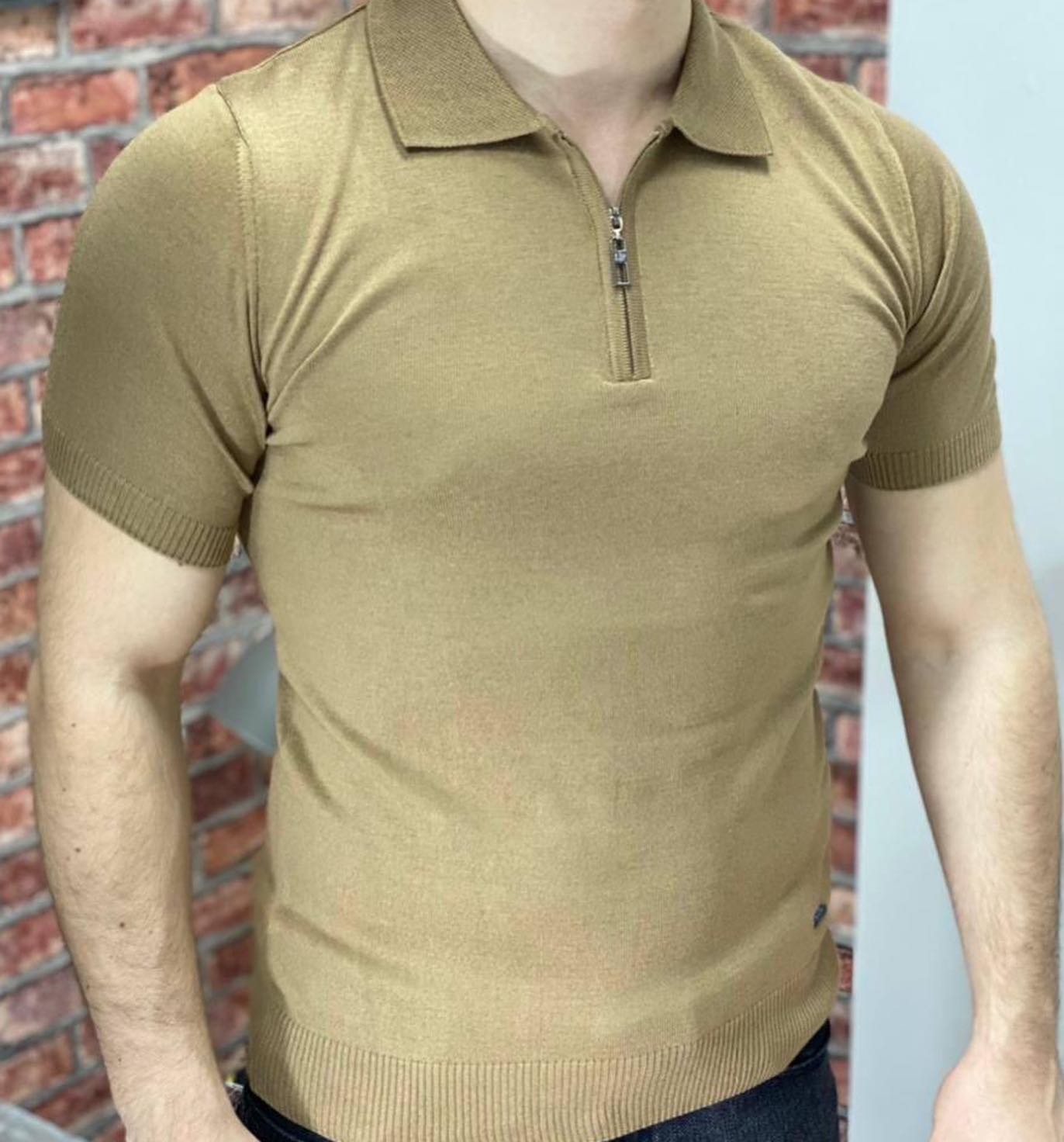 Это мужское поло с коротким рукавом и воротником-стойкой, выполненное в базовом бежевом цвете. Модель дополнена удобной молнией на груди, позволяющей регулировать глубину выреза. Поло имеет классический приталенный силуэт, который подчеркивает фигуру. Оно отлично подходит для создания как повседневных, так и более элегантных образов, сочетаясь с джинсами, брюками чинос или шортами.