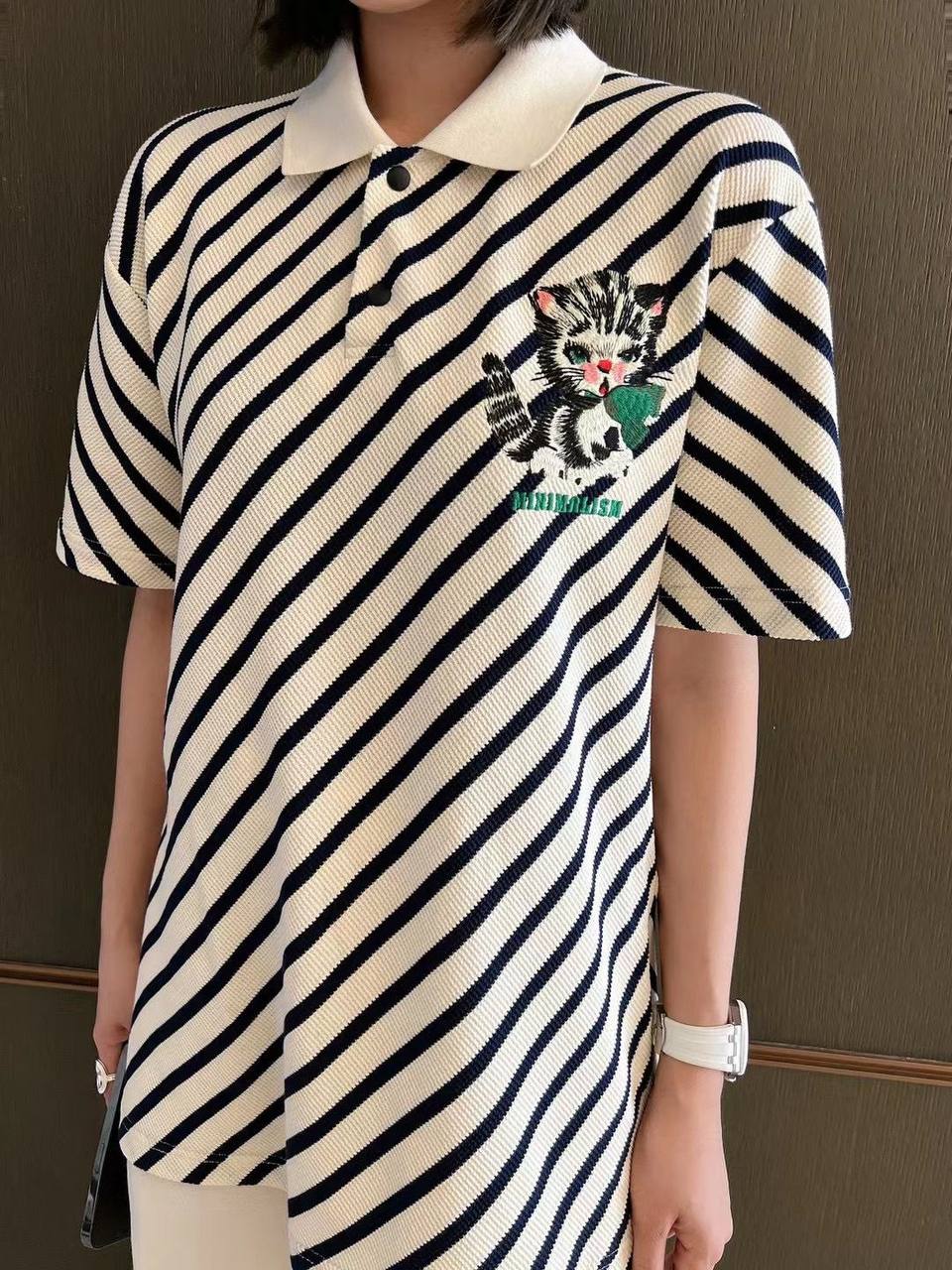Поло LUX-68307 от бренда LUXE-CRIME представляет собой стильную и оригинальную модель, сочетающую классический крой поло с игривым принтом. Поло выполнено в черно-белую полоску, а на груди украшено вышитым изображением милого котенка с зеленым листочком. Белый воротник и планка с двумя пуговицами придают изделию элегантности.