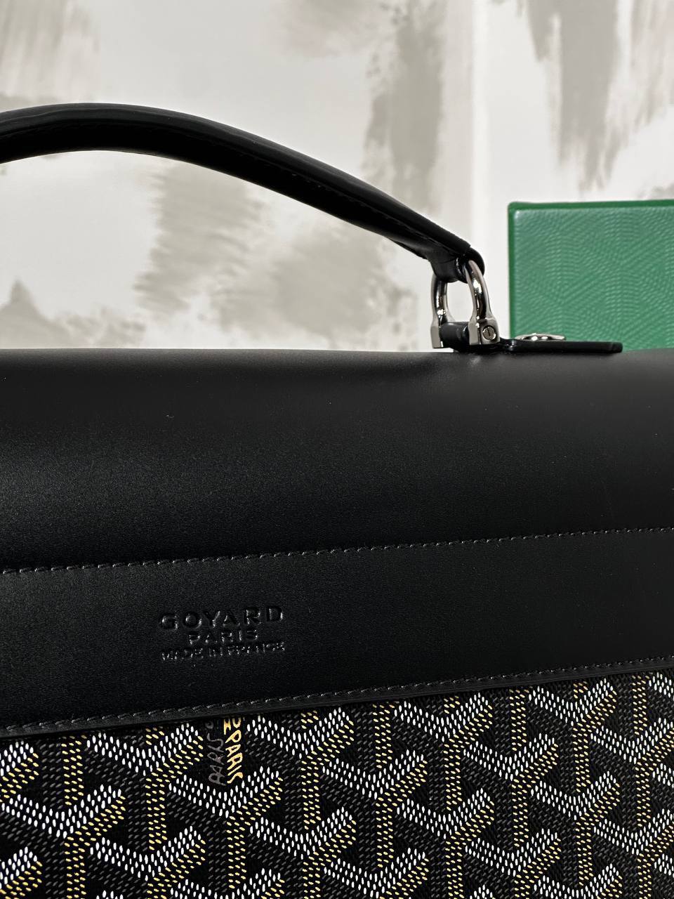 Портфель Goyard LUX-93676 представляет собой стильный аксессуар, сочетающий в себе элегантность и функциональность. Черный цвет верхней части портфеля контрастирует с узнаваемым узором на нижней части, добавляя изысканности. Этот портфель идеально подойдет для деловых встреч и повседневного использования, подчеркивая статус и вкус владельца.