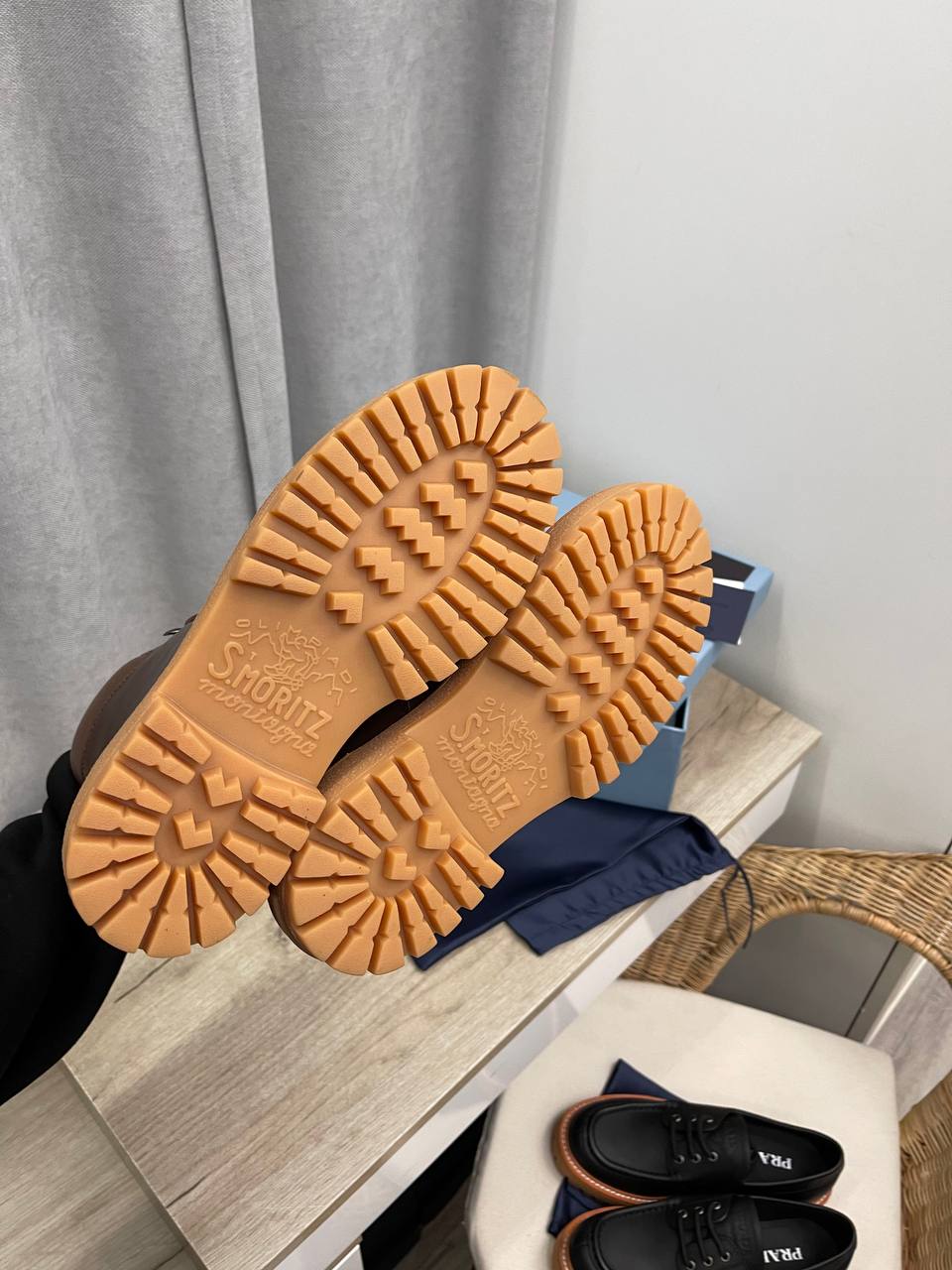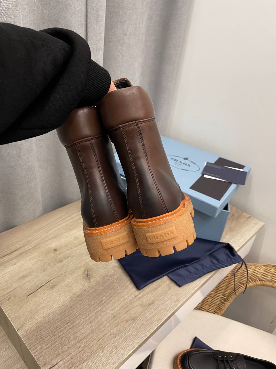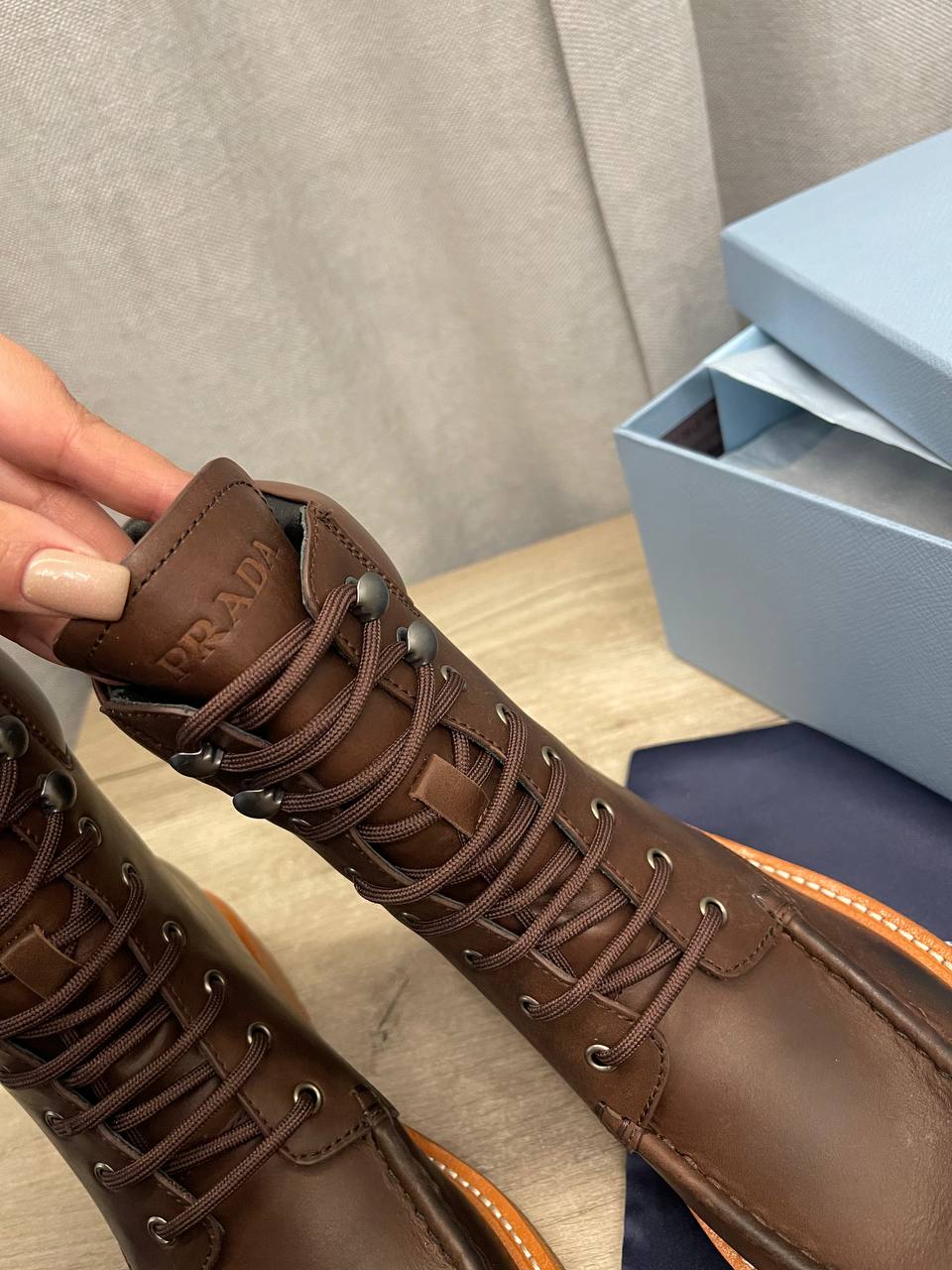 Prada ботинки LUX-112459 — это стильные ботинки в классическом стиле. Коричневый цвет, прочная текстура и грубая подошва делают эту обувь идеальным выбором для повседневной носки в прохладное время года.