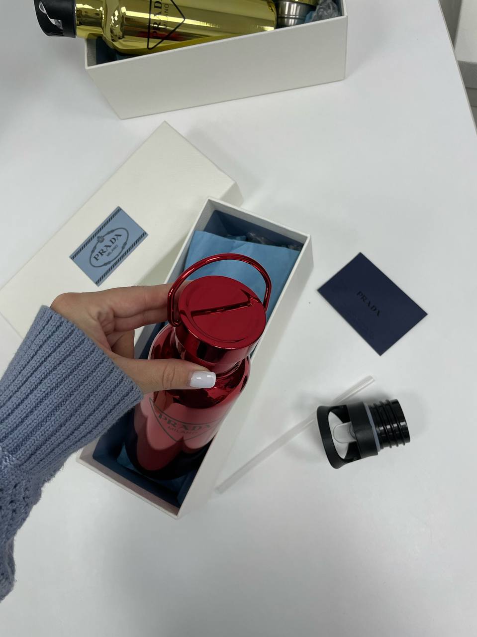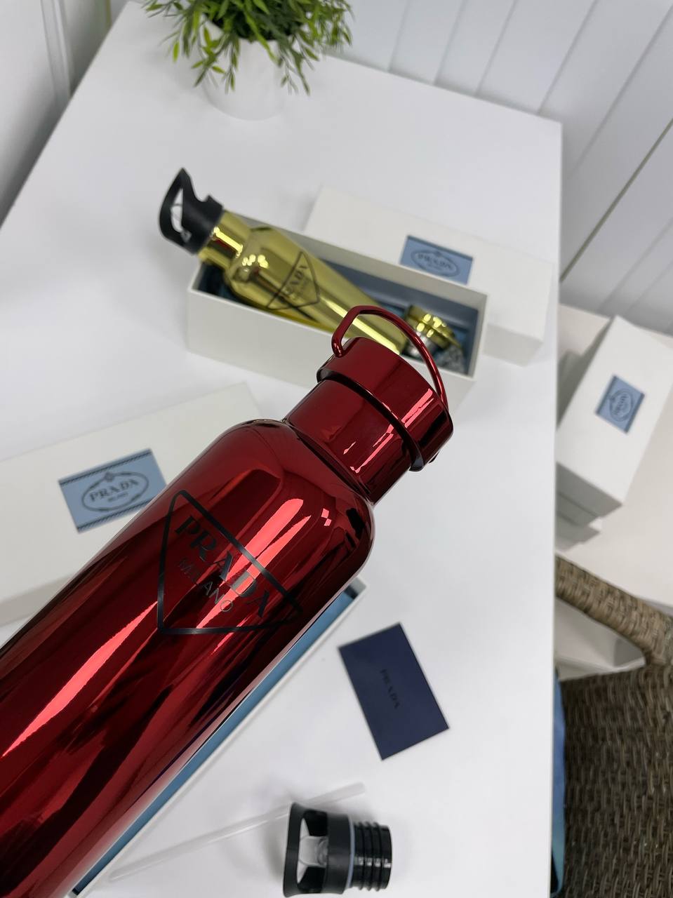 Фляга Prada LUX-86841, представленная на изображении, выполнена в элегантном стиле. Она имеет глянцевую поверхность насыщенного красного цвета. Фляга идеально подходит для тех, кто ценит стиль и функциональность в повседневной жизни.