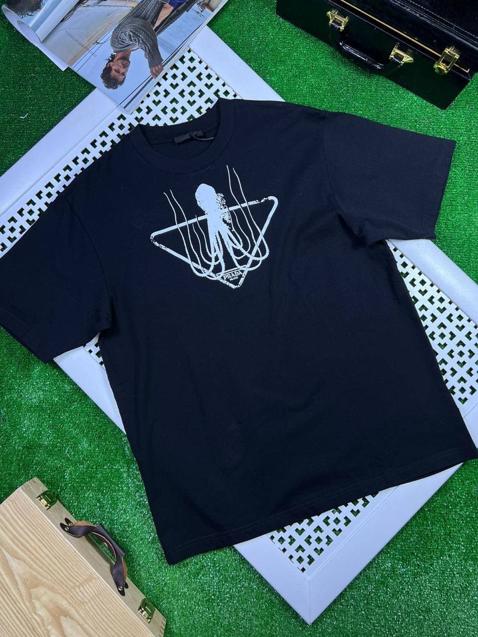 Prada Футболка LUX-62654 — это стильная черная футболка с эксклюзивным принтом осьминога, идеально подходящая для создания современных и запоминающихся образов. Классический крой и контрастный белый рисунок делают эту модель универсальным элементом гардероба.