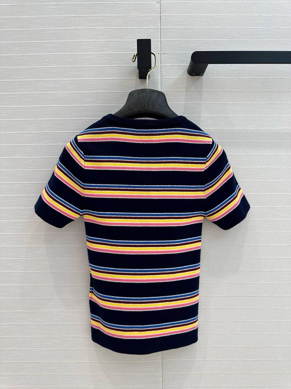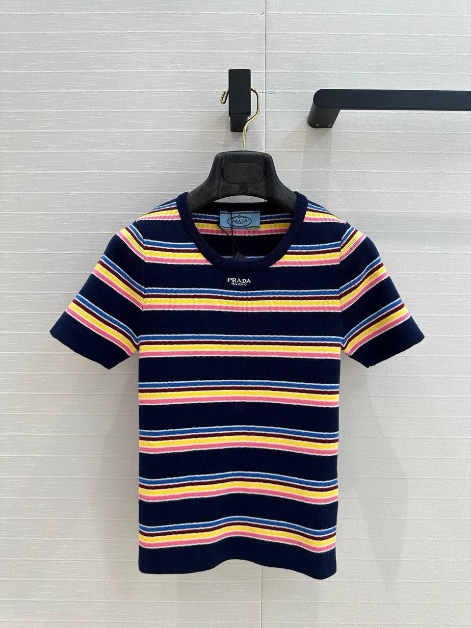 Футболка Prada LUX-117024 - это стильный предмет гардероба от известного бренда. Футболка выполнена в полосатом дизайне, сочетающем в себе темно-синий, розовый, желтый и голубой цвета. Её текстура придает изделию элегантность и делает его подходящим для различных повседневных образов.