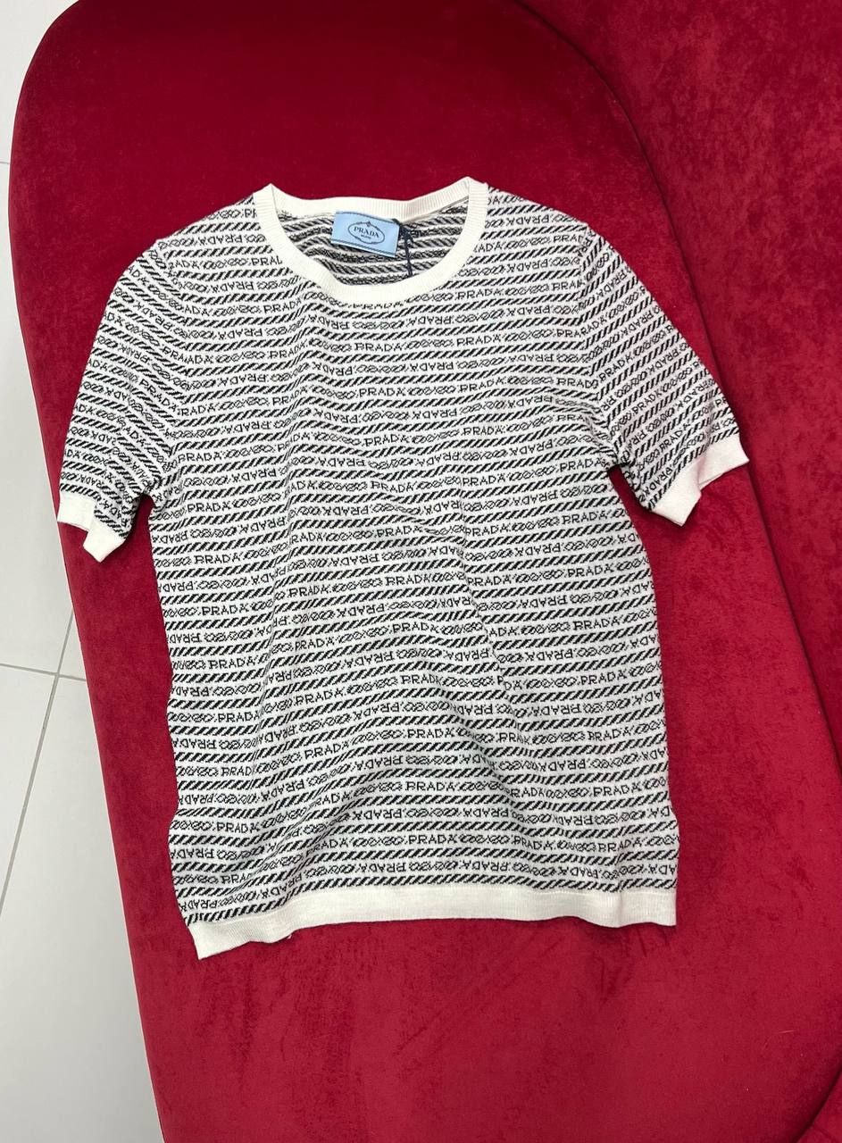 Футболка Prada LUX-117482 – это стильный предмет гардероба от известного бренда. Футболка выполнена в черно-белых тонах с уникальным текстурированным узором и фирменными надписями. Подходит для создания модных повседневных образов.
