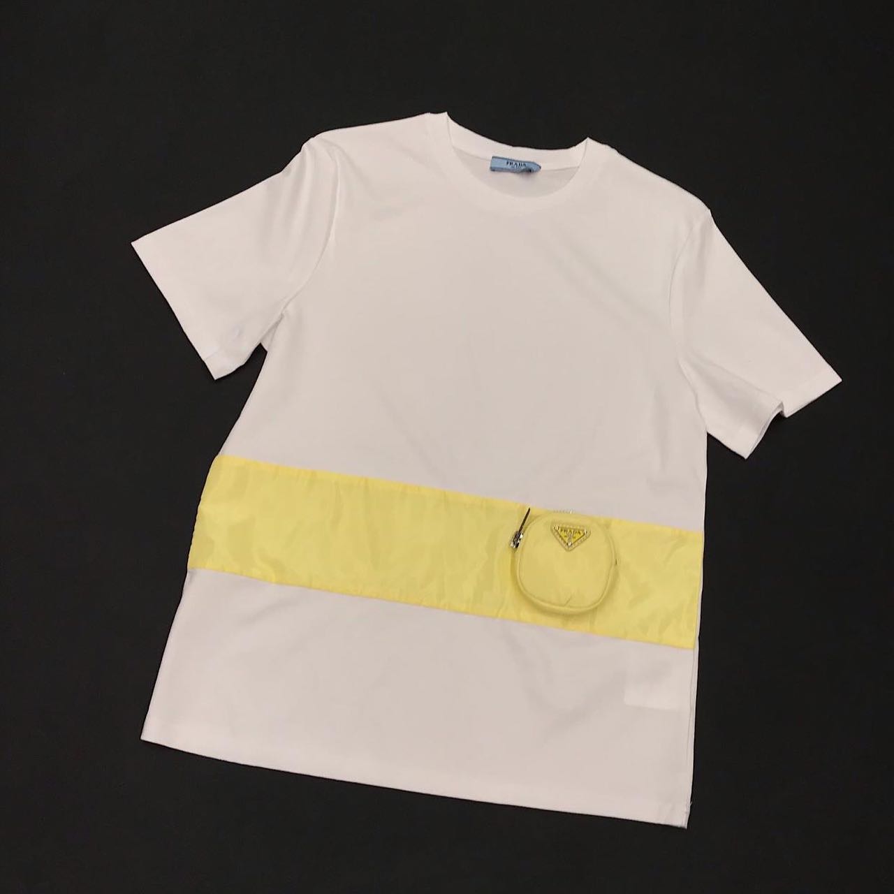 Женская футболка Prada LUX-32166 — это стильный элемент гардероба, сочетающий классический крой с современными деталями. Белый цвет футболки прекрасно контрастирует с яркой желтой полосой, добавляя образу динамичности. Небольшой декоративный кармашек с логотипом бренда придает изделию узнаваемость и функциональность. Эта модель идеально подойдет для создания непринужденных повседневных образов.