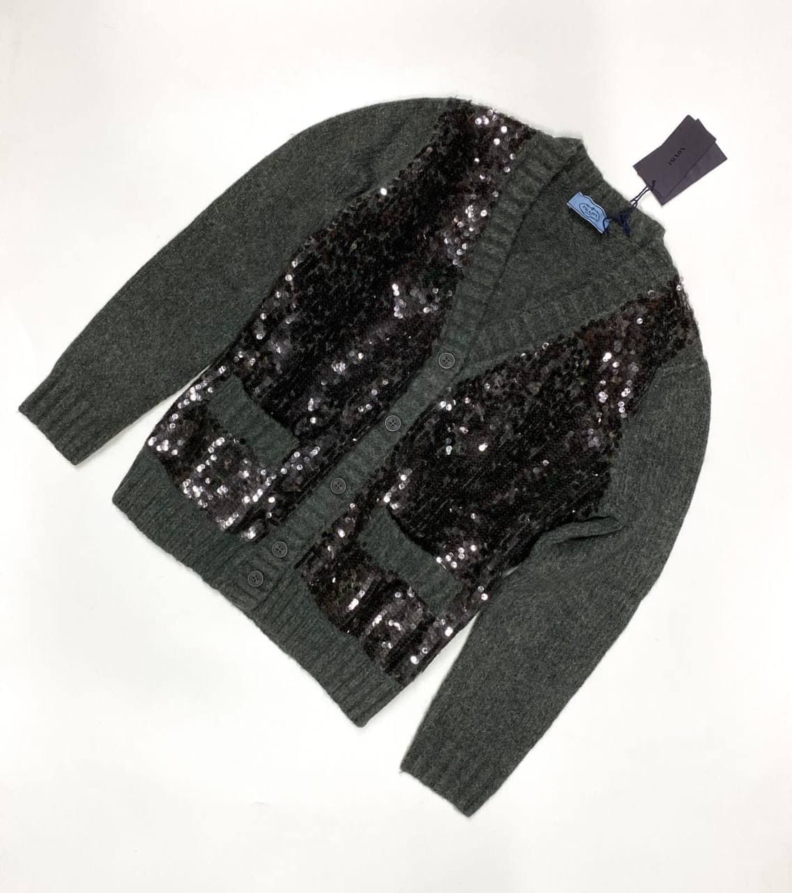 Кардиган Prada LUX-60233 – это элегантный элемент женского гардероба, сочетающий в себе классический крой и эффектные детали. Модель выполнена в темно-сером цвете и украшена вставками из глянцевых пайеток, придающих изделию особый шик. Такой кардиган идеально подойдет для создания как повседневных, так и вечерних образов, добавляя им нотку роскоши и индивидуальности.