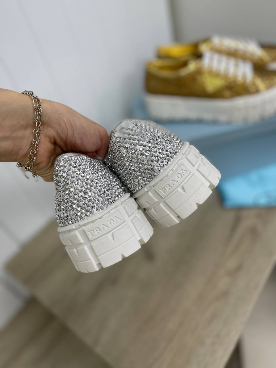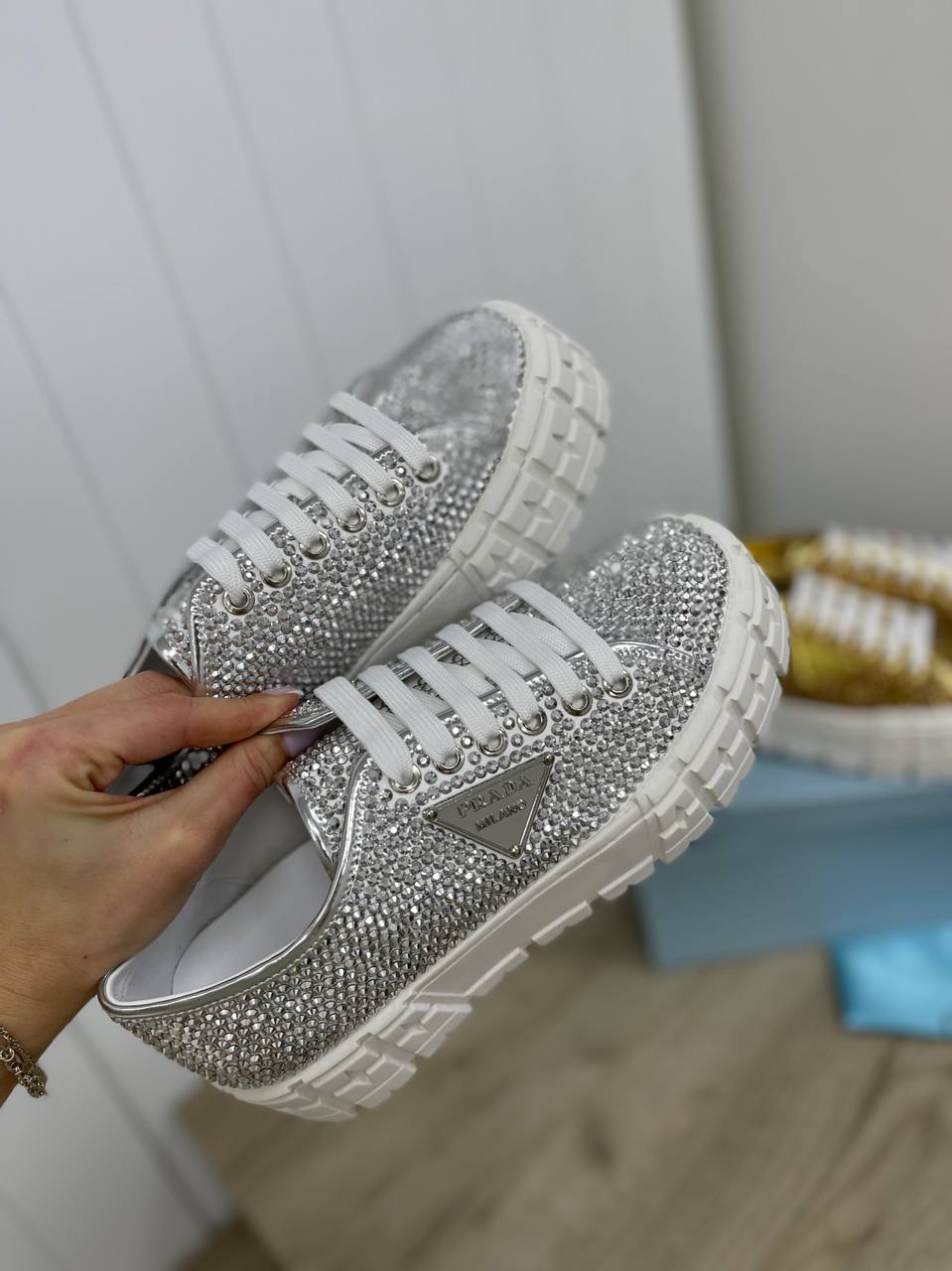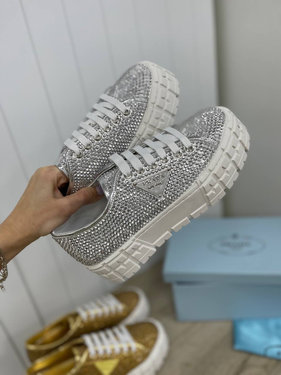 Кеды женские Prada LUX-85267 – это воплощение роскоши и стиля. Серебристые кеды с массивной белой подошвой полностью покрыты мелкими сверкающими деталями, что придает им эксклюзивный вид. Фирменный логотип бренда украшает боковую часть обуви, подчеркивая ее премиальное происхождение.
