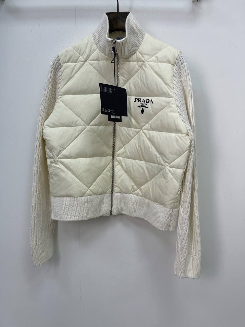 Кофта Prada LUX-76553 представляет собой стильную и теплую верхнюю одежду, выполненную в белом цвете. Дизайн кофты сочетает в себе стеганую текстуру в области груди и спины с вязаными рукавами и воротником, создавая уникальный и современный образ. Она идеально подходит для повседневной носки, обеспечивая комфорт и защиту от холода.