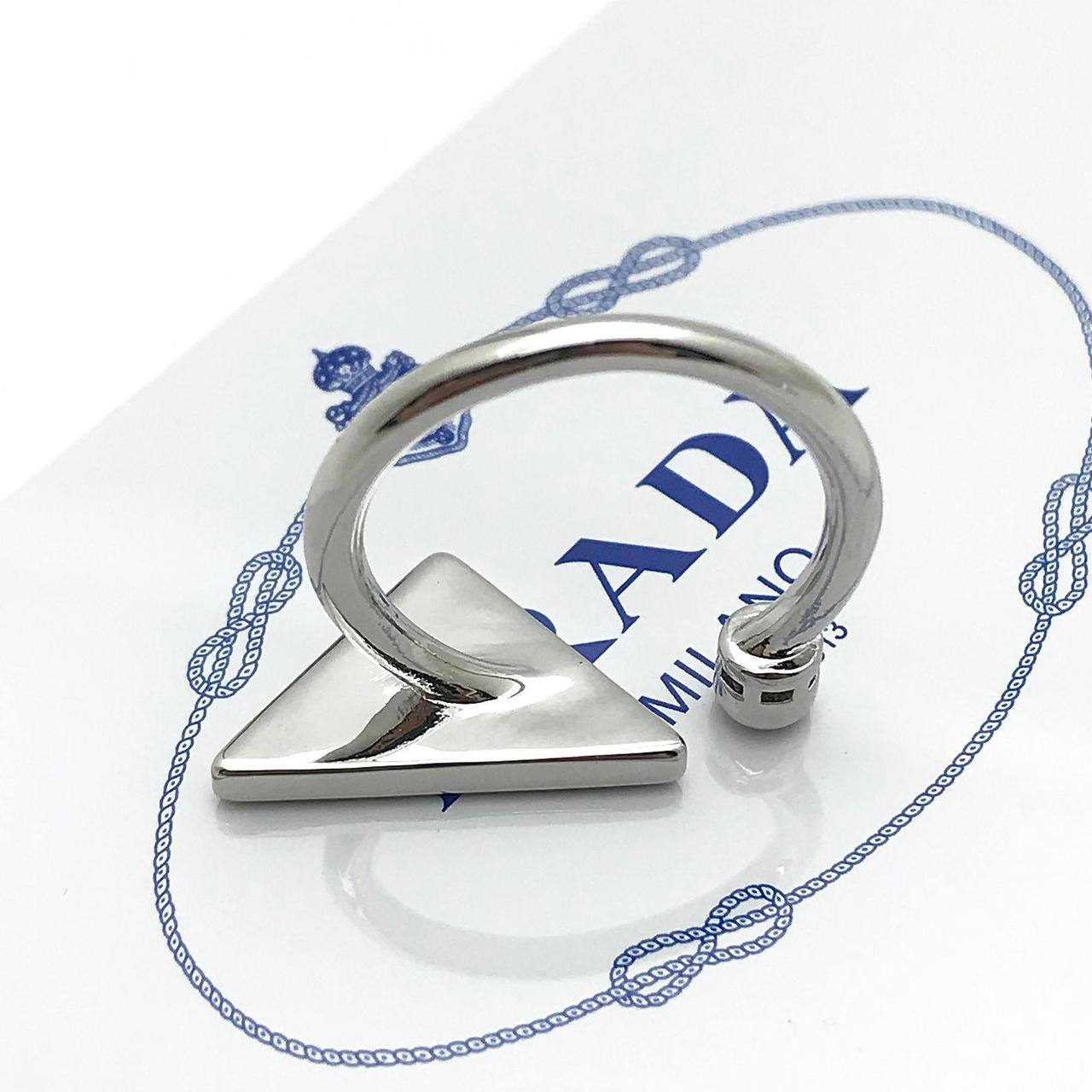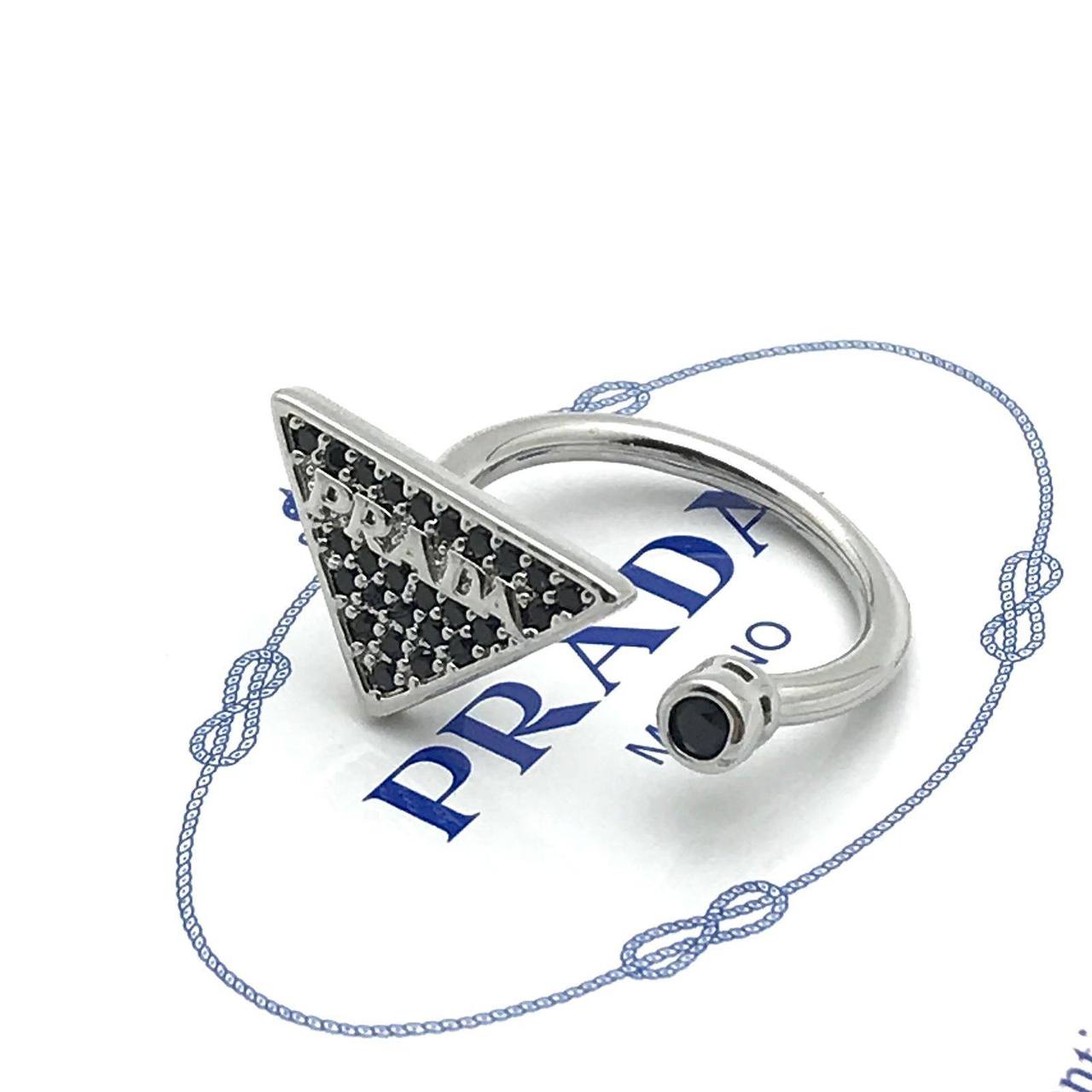 Стильное кольцо Prada с треугольным элементом, инкрустированным черными камнями, и логотипом бренда. Дизайн сочетает в себе элегантность и современность, идеально подходящий для повседневной носки и особых случаев.