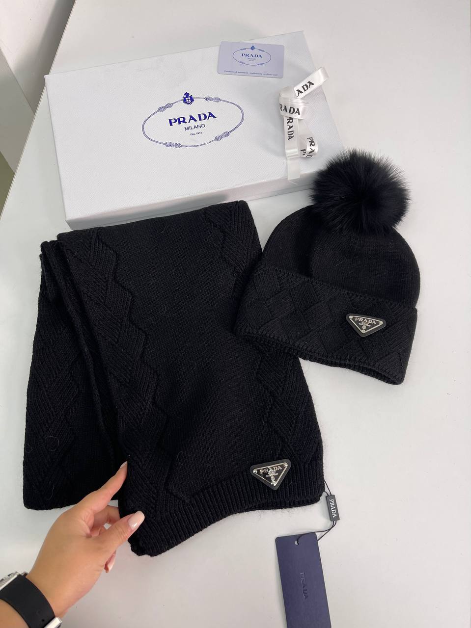 Комплект Prada LUX-78800 – это элегантный набор, состоящий из шапки с помпоном и шарфа, выполненных в классическом стиле. Комплект представлен в черном цвете, имеет текстуру вязки и украшен фирменным логотипом бренда. Такой комплект станет отличным дополнением к повседневному гардеробу, обеспечивая тепло и комфорт в холодное время года.