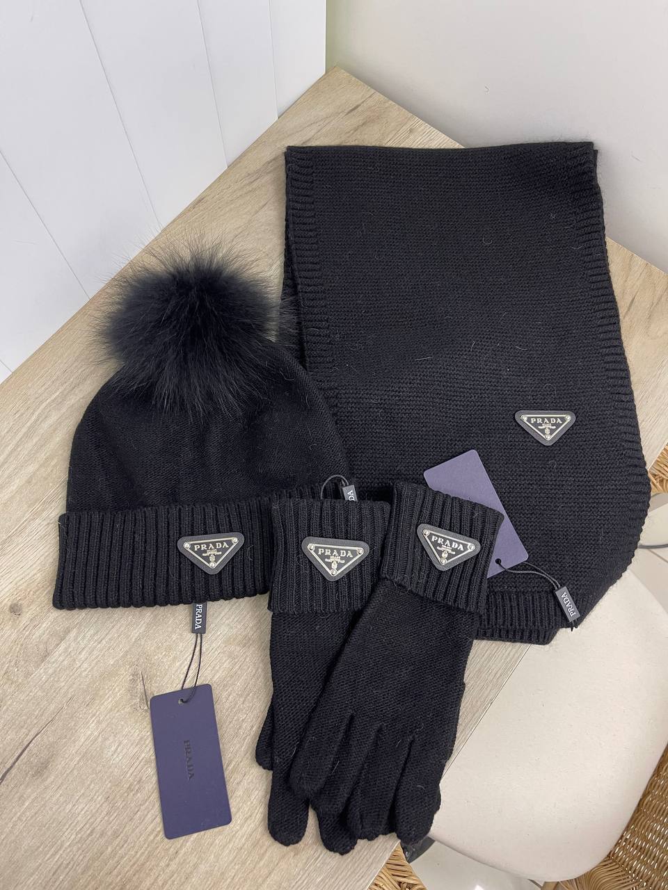 Комплект Prada LUX-81759 представлен в классическом черном цвете, состоящий из шапки с помпоном, шарфа и перчаток. Комплект выполнен в элегантном стиле, с фирменным логотипом бренда. Идеально подходит для создания стильного образа в холодное время года.