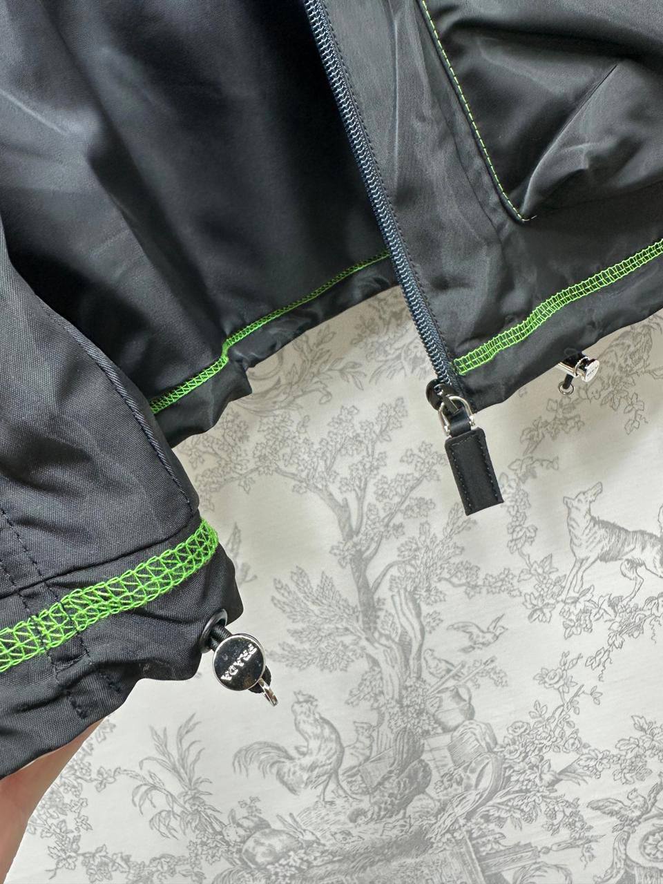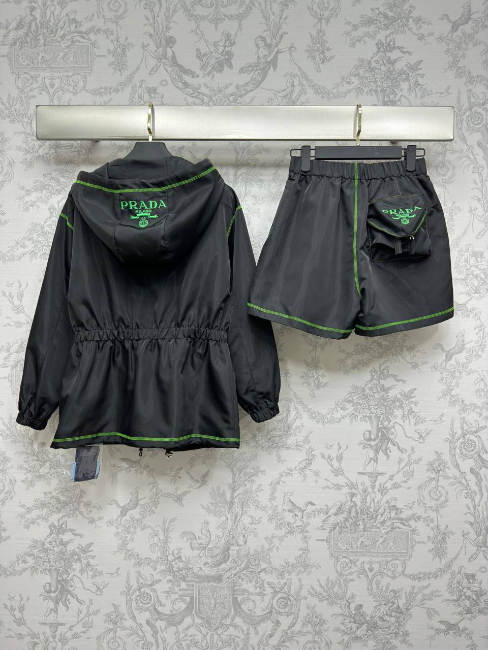 Костюм женский Prada LUX-104040 — это стильный комплект, воплощающий современный спортивный стиль. Он включает в себя куртку с капюшоном и шорты, выполненные в чёрном цвете с контрастными неоновыми зелеными деталями. Этот костюм идеально подходит для создания модных и комфортных образов в повседневной жизни.