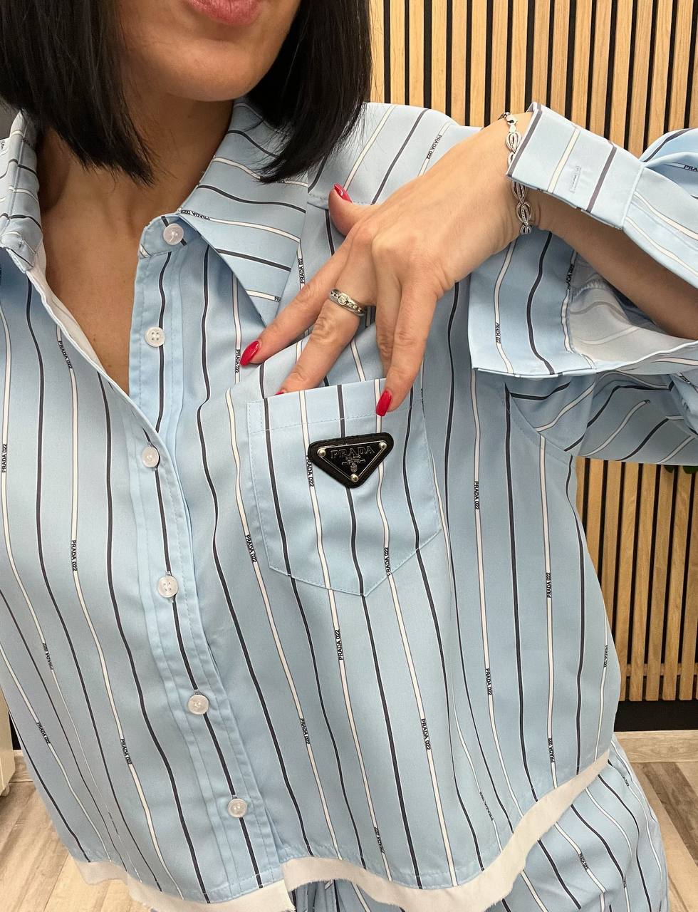 Костюм женский Prada LUX-105527 представляет собой стильный комплект, включающий рубашку и шорты. Модель выполнена в небесно-голубом цвете с вертикальными полосками, что придает ей свежий и современный вид. Идеально подходит для создания повседневных и расслабленных образов.