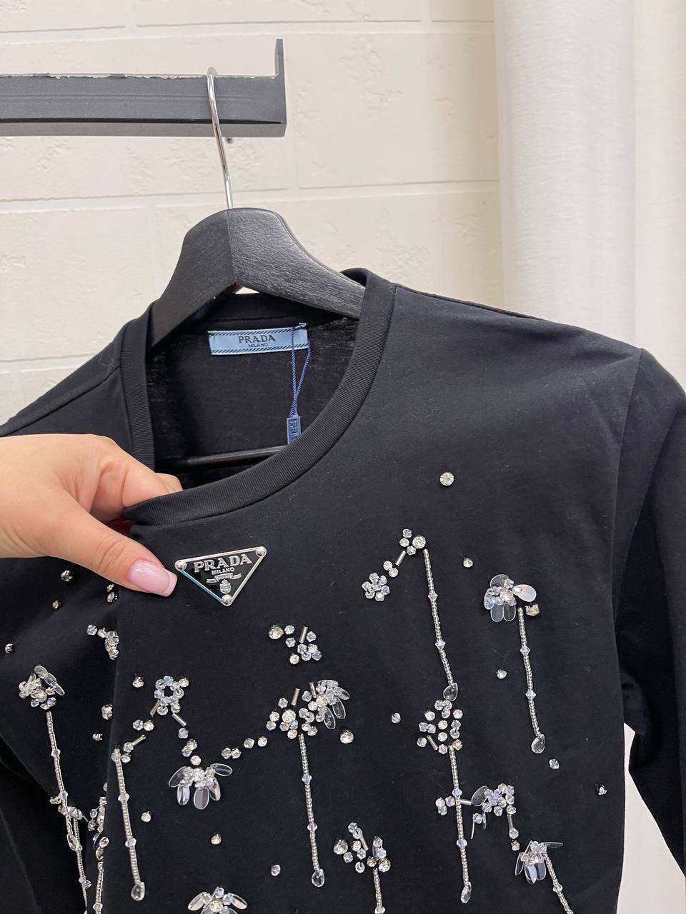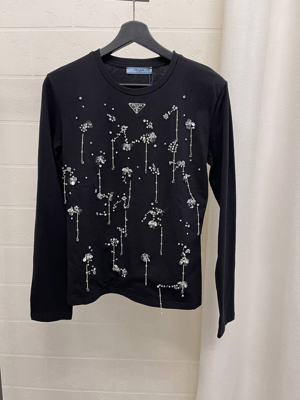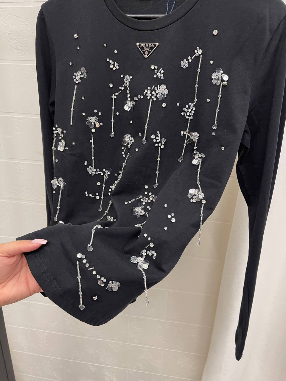 Лонгслив Prada LUX-105530 - это стильный элемент гардероба от известного бренда. Лонгслив выполнен в классическом черном цвете, украшен декоративными элементами в виде блестящих узоров, что придает ему изысканный вид. Идеально подойдет для создания элегантных и современных образов.