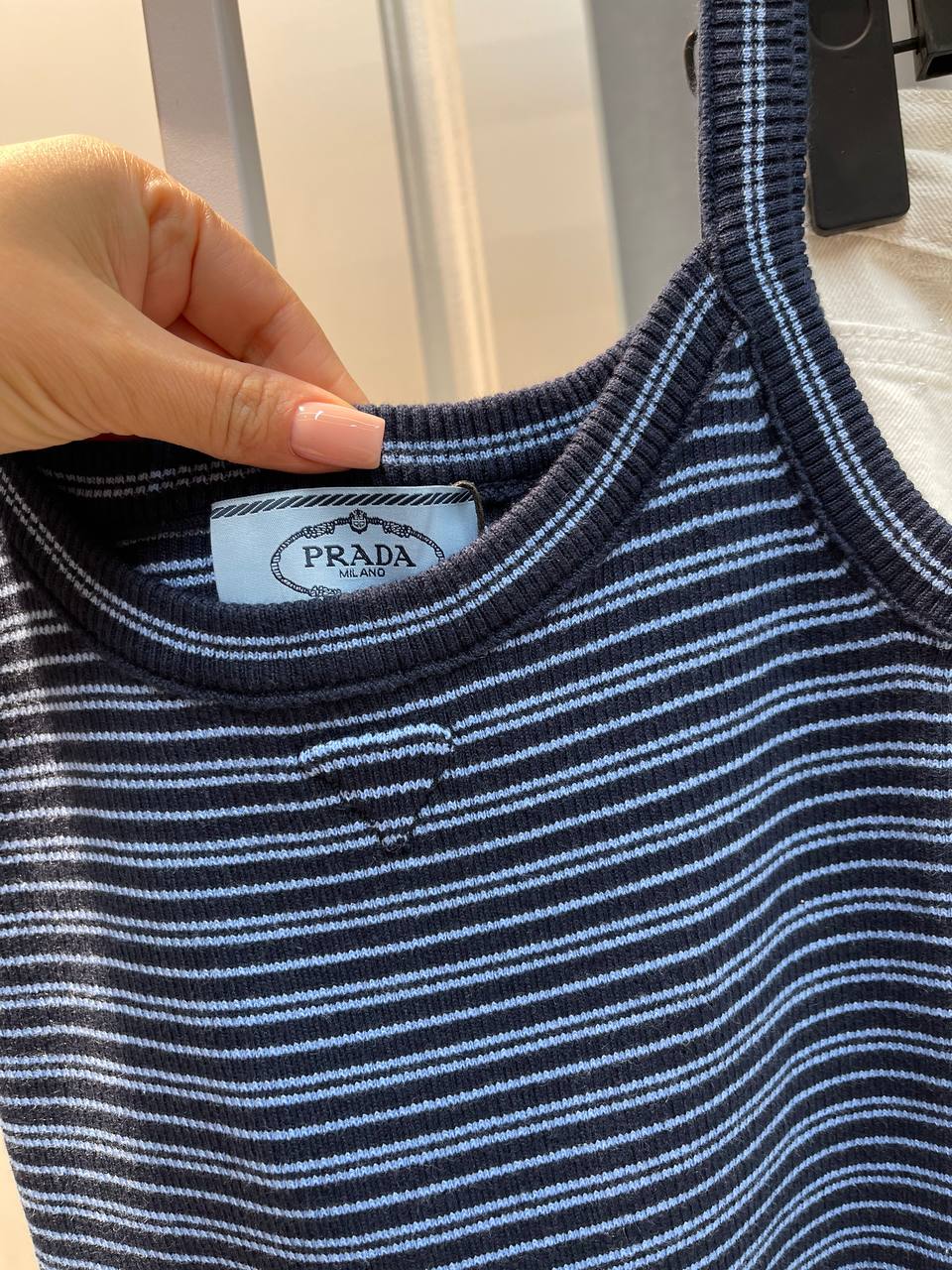 Майка Prada в полоску - это стильный и удобный предмет гардероба для создания модных образов. Она отличается лаконичным дизайном и высоким качеством исполнения. Идеальный выбор для повседневной носки.