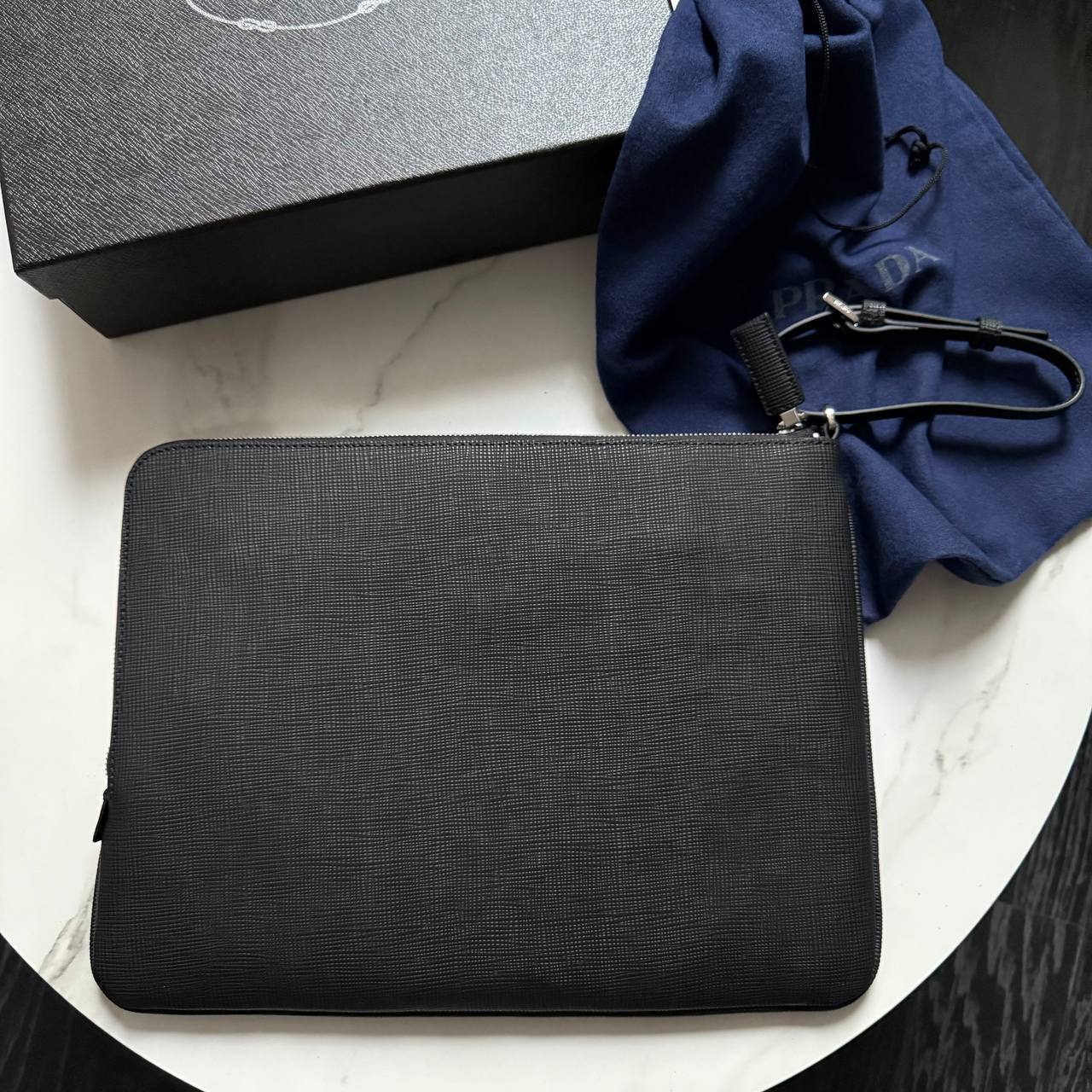 Папка Prada LUX-115558, представленная на изображении, выполнена в классическом стиле с элементами роскоши. Черный цвет, матовая текстура и минималистичный дизайн делают её универсальным аксессуаром для деловых встреч или повседневного использования. Папка подходит для хранения документов, планшета и других необходимых предметов.