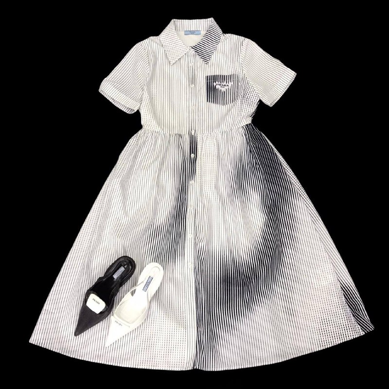 Изысканное платье-рубашка Prada LUX-49283 выполнено в элегантном стиле, сочетая классические элементы с современным дизайном. Легкая и струящаяся ткань, а также свободный крой создают неповторимый образ. Вертикальная полоска, плавно переходящая в графический принт, визуально удлиняет силуэт, делая его более изящным.