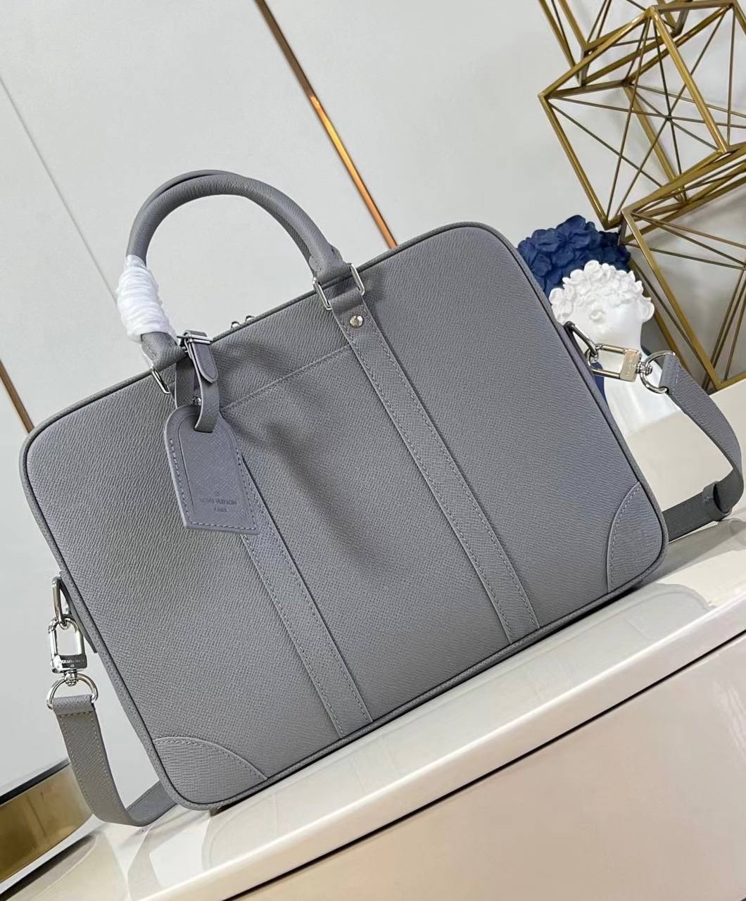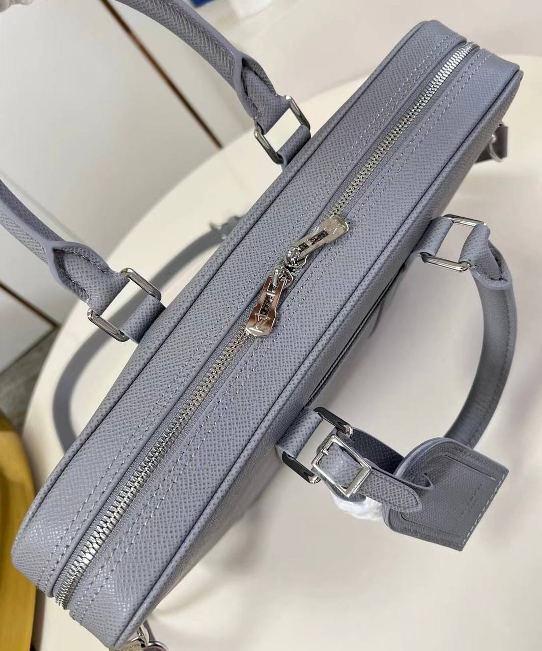 Портфель из сафьяновой кожи Prada LUX-118007 — это элегантный аксессуар, выполненный в строгом деловом стиле. Серо-голубой оттенок добавляет сдержанности и утонченности, а текстурированная поверхность подчеркивает премиальность изделия. Этот портфель предназначен для деловых встреч и повседневного использования, идеально подходит для переноски документов и важных мелочей.