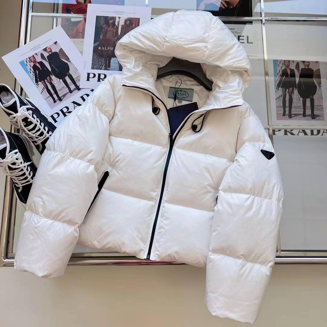 Пуховик Prada LUX-75819 – это стильная и теплая верхняя одежда для холодной погоды. Белый пуховик с капюшоном и черными элементами. Эта куртка идеально подойдет для создания комфортного и элегантного образа.