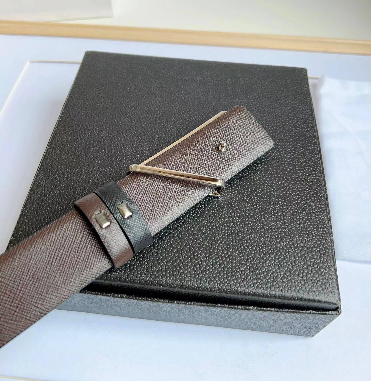 Двусторонний ремень Prada LUX-87902 — это воплощение элегантности и стиля. Чёрный ремень с коричневой внутренней стороной идеально дополнит как повседневный, так и деловой образ. Уникальная пряжка добавляет изысканности.