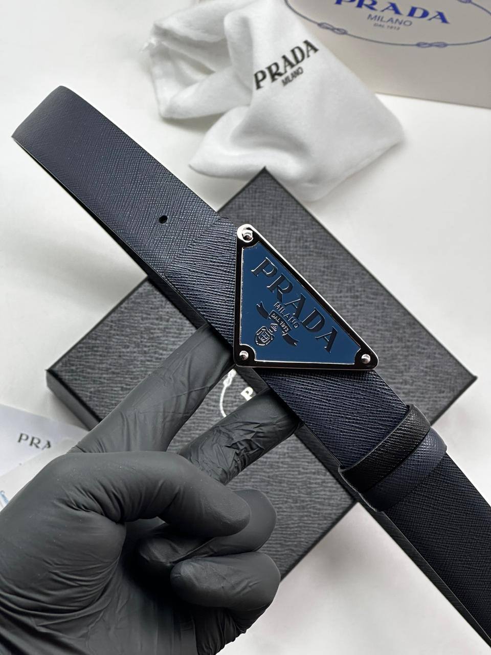 Ремень мужской Prada LUX-91760 – элегантный аксессуар для современного мужчины. Этот ремень выполнен в классическом стиле, сочетая в себе простоту и изысканность. Темно-синий цвет, текстурированная поверхность и фирменная пряжка с логотипом бренда делают его универсальным дополнением к любому образу.