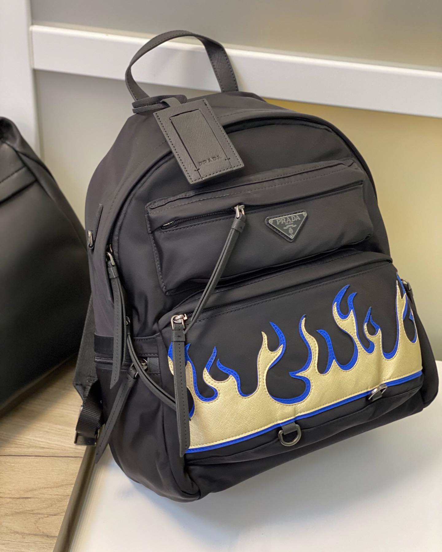Этот черный рюкзак Prada LUX-43706 – стильный аксессуар, сочетающий классические линии бренда с дерзким дизайном. Оригинальная вышивка в виде языков пламени в золотистых и синих тонах придает ему уникальность и делает его заметным элементом любого образа. Рюкзак идеально подойдет для тех, кто ценит высокое качество и хочет выделиться из толпы.