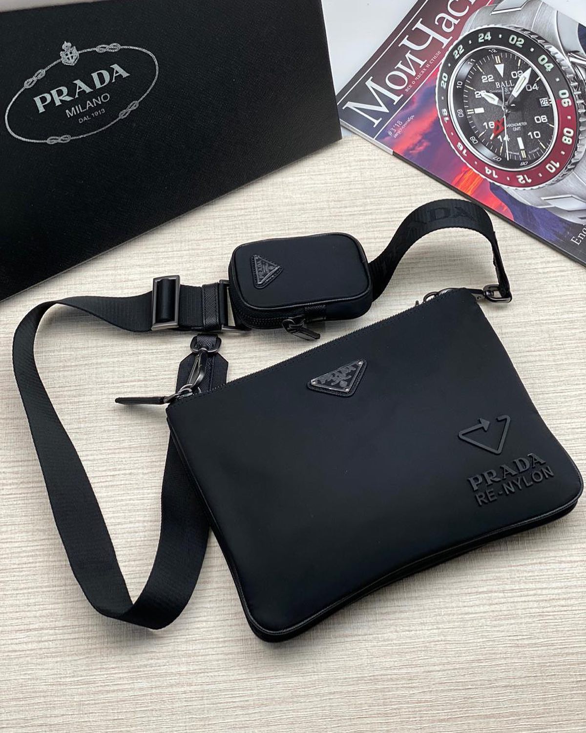 Сумка мужская Prada LUX-40679 представляет собой стильный и функциональный аксессуар в современном городском стиле. Черный цвет и минималистичный дизайн делают ее универсальной для различных образов. На передней панели сумки расположен узнаваемый треугольный логотип Prada, а также надпись "PRADA RE-NYLON", подчеркивающая использование экологичных материалов.