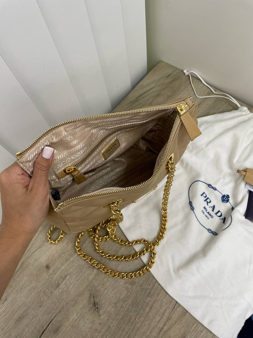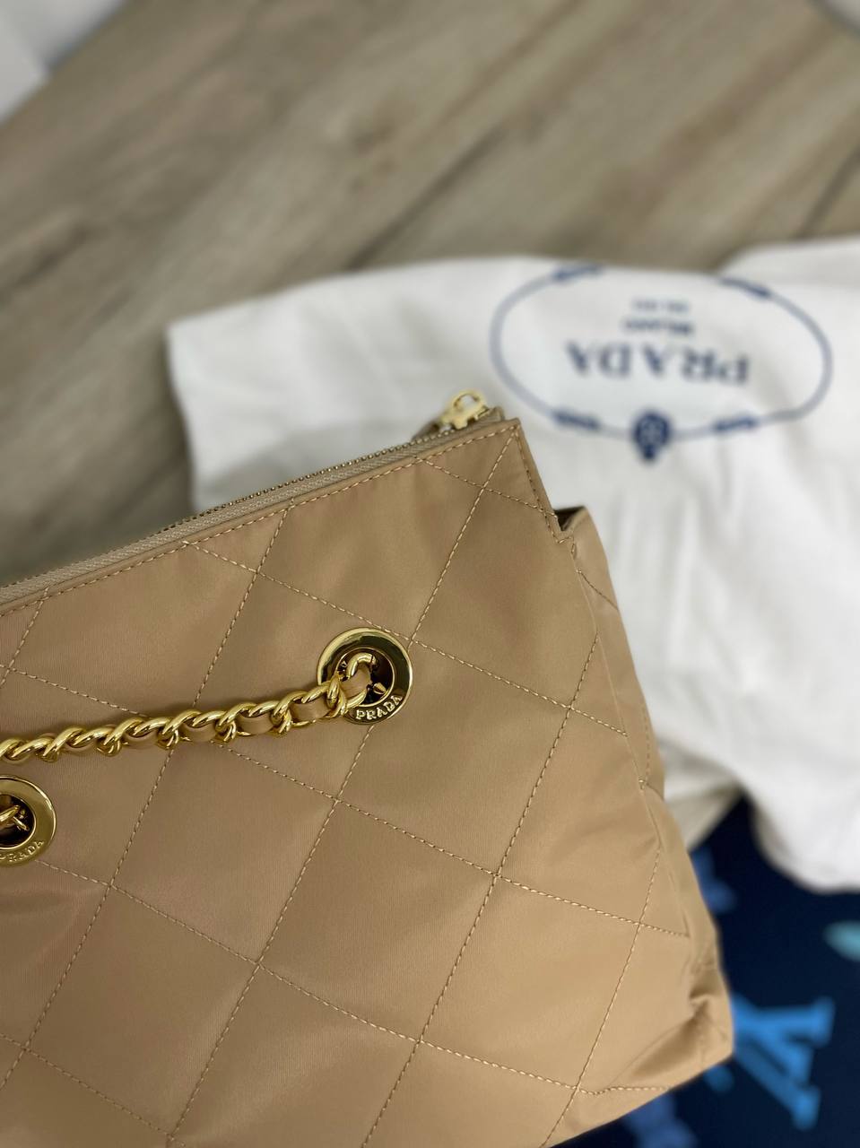 Сумка женская Prada LUX-92426 выполнена в стеганом дизайне в светлом бежевом цвете, придающем ей элегантный вид. Сумка имеет золотую фурнитуру, включая цепочку, что добавляет роскоши. Она идеально подходит для повседневного использования, дополняя любой образ.