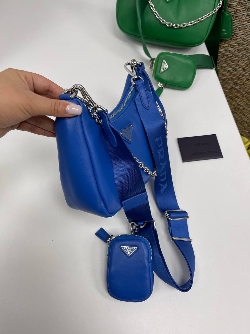 Сумка женская Prada LUX-86928 — элегантная сумка через плечо от Prada в насыщенном синем цвете. Сумка имеет узнаваемый дизайн с фирменным логотипом бренда, металлической цепочкой и дополнительным небольшим кошельком. Этот аксессуар станет отличным дополнением к повседневному или вечернему образу.