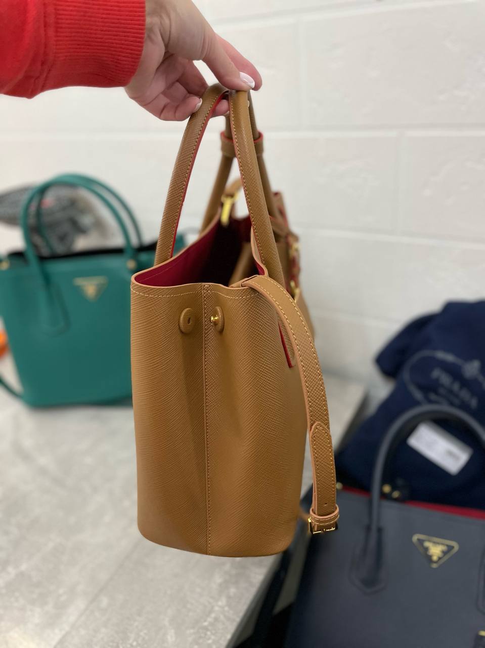 Сумка женская Prada LUX-98181 представляет собой элегантную модель в классическом стиле. Она выполнена в рыже-коричневом цвете с красными деталями, создавая эффектный контраст. Сумка имеет прямоугольную форму и оснащена ручками и съемным плечевым ремнем.